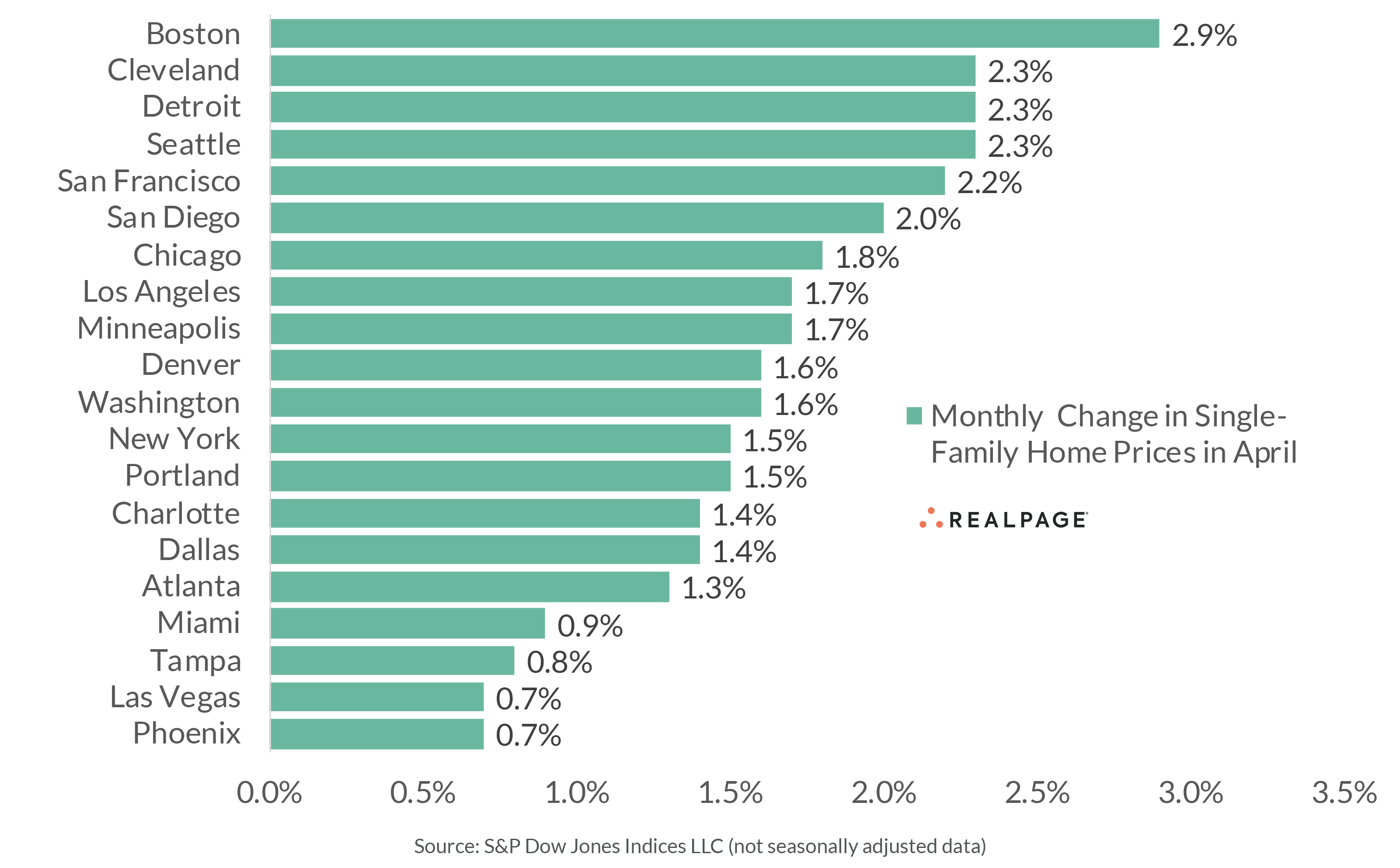 U.S. home prices rose in April due to a limited supply of for-sale listings. However, on an annual basis, home prices posted a decline for the first time in 11 years, as higher mortgage rates made home purchases more expensive for buyers. Home prices were up 1.3% from March to April, according to the S&P CoreLogic Case-Shiller U.S. National Home Price Index, which measures average home prices across the nation. While that was the third month in a row that prices have increased, the annual rate of change has weakened over the past year. Home prices were down 0.2% year-over-year in April 2023, a weaker result than the 0.7% annual increase in March 2023 and the first annual decline since April 2012. Looking at more granular results, the S&P CoreLogic Case-Shiller 20-City Composite Index, which tracks prices in the 20 largest metros, posted a 1.3% month-over-month gain, while the annual change went from a decline of 1.1% in March to a decline of 1.7% in April. In April, all 20 cities in the index reported month-over-month price increases. The largest monthly increase was in Boston (2.9%), followed by Cleveland, Detroit and Seattle (all three at 2.3%). On an annual basis, 10 of the 20 metro areas recorded lower prices, with the deepest pull backs in West region markets, led by Seattle (-12.4%) and San Francisco (-11.1%). The nation’s biggest annual hikes were primarily in South region markets, led by Miami (5.2%), Chicago (4.1%), Atlanta (3.5%) and Charlotte (3.4%).