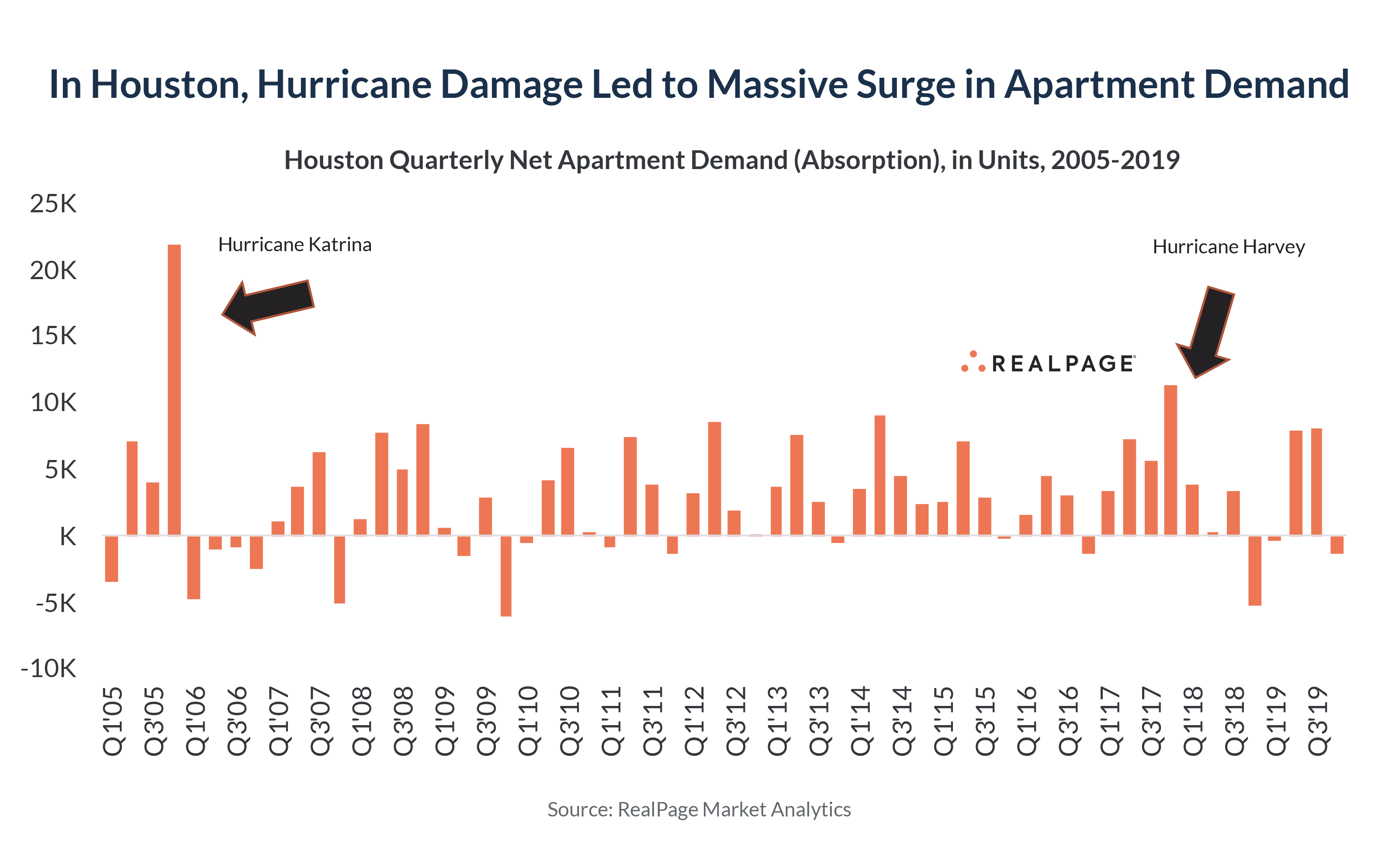 History shows us that after a major storm, vacant rental units fill up fast. Displaced households need a place to live. After Harvey hit, Houston saw a huge surge in apartment demand. In fact, the more than 11,000 units absorbed in 4th quarter 2017 ranked as the metro’s second-largest ever (at the time). The top quarter ever in Houston for apartment demand? That was back in 2005, when Hurricane Katrina evacuees migrated from New Orleans.