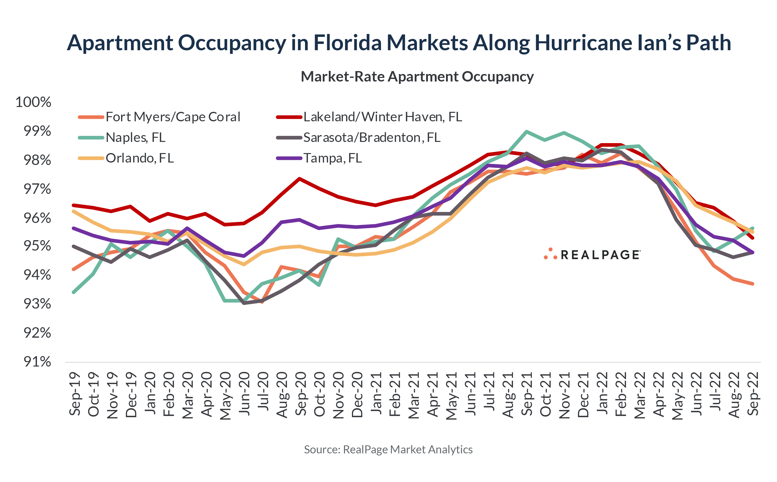 That’s a bit of good news: There are more apartment vacancies today available for displaced households than there would have been had the storm occurred a year ago. After COVID hit, Florida markets saw a big spike in apartment demand from the work-from-anywhere and live-anywhere crowd relocating to the state, taking occupancy rates to ultra-high levels. But 2022 brought a big shift in momentum, erasing some of those gains.