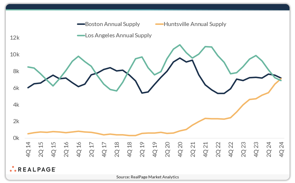 A small Alabama market is growing fast, ranking among the nation’s largest apartment markets for total new supply additions in the past year. Apartment deliveries in Huntsville totaled 7,097 units in calendar 2024, which was well ahead of historical norms for this market and swelled the existing unit base by 17.4% – easily the biggest increase nationwide. But what’s even more telling is that this market ranked 24th among the nation’s largest 150 apartment markets for completions in the past year. That’s a ranking usually reserved for one of the nation’s top 50 markets. And the two markets next to Huntsville on that list – Boston at #23 and Los Angeles at #25 – are obviously much bigger. For perspective, Huntsville had about 47,800 market-rate apartment units at the end of 2024. Boston is about nine times bigger than that, while Los Angeles is roughly 24 times the size of Huntsville. Driving the demand for new housing in Huntsville is a unique economy based in the Government and Professional/Business Services sectors, as the market is home to the U.S. Army’s Redstone Arsenal and NASA’s Marshall Space Flight Center. Taking a longer time horizon, Huntsville’s apartment supply has been climbing at one of the fastest rates nationwide since about 2022.