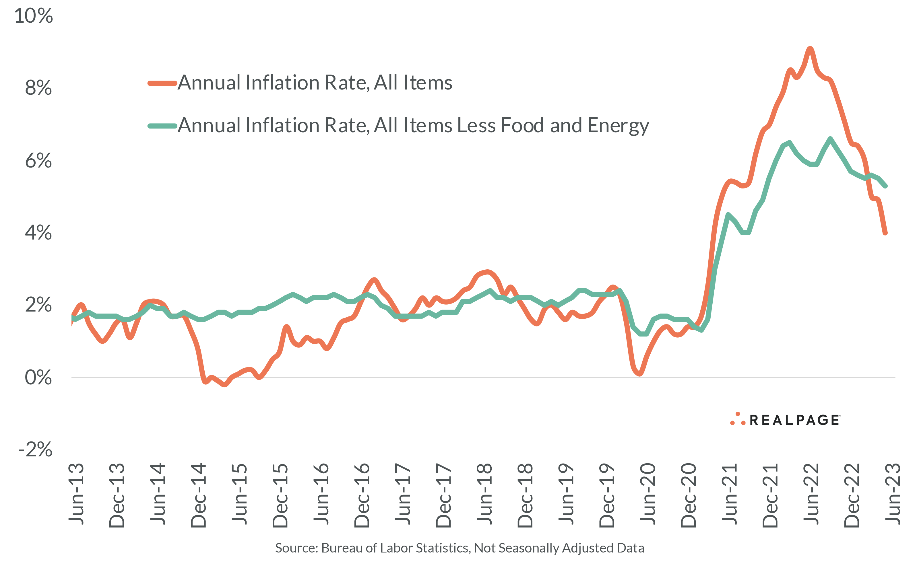 Consumer price increases are retreating from decade highs, with the cost of goods and services for U.S. consumers easing for the 12th consecutive month. The Consumer Price Index (CPI) for All Urban Consumers, a measure of price changes commonly referred to as the inflation rate, registered at 3% in the year-ending June 2023, the lowest level since March 2021, according to the Bureau of Labor Statistics. The annual inflation rate in June was in line with economists’ expectations of 3.1% and well below May’s 4% annual gain. In addition, inflation has cooled considerably since reaching a 40-year high of 9.1% in June 2022. Still, inflation has been well above the Fed’s target rate of 2% annually – the pre-pandemic norm. Excluding volatile food and energy prices, the core CPI increased 4.8% during the year-ending June, down from the 5.3% annual increase in May and the lowest level since October 2021. Looking at other indexes, shelter, which accounts for about one-third of the total CPI index, saw a 7.8% year-over-year price surge in June, still registering as one of the biggest annual gains in the past 40 years. Meanwhile, the cost of food was up 5.7% over the past year. And new vehicles posted an annual price increase of 4.1%. Contributing to the lower inflation rate, the cost of energy dropped 16.7% year-over-year in June, with the cost of gasoline (-26.5%) having a deep impact on that decline. The price of used cars and trucks (-5.2%) was also down on an annual basis. Airline fares, which saw huge price jumps in 2022 through early 2023, fell 18.9% in the year-ending June.