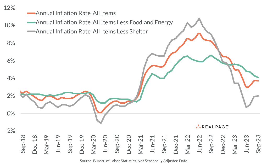 Inflation held steady for a second month, remaining well above the Fed’s target rate. The price of goods and services paid by U.S. consumers rose 3.7% in the year-ending September, according to the Consumer Price Index (CPI) for All Urban Consumers measured by the Bureau of Labor Statistics. This increase matched the growth seen in August and was quite a bit ahead of the recent low of 3% from June. Annual inflation as of September was a touch above economists’ expectations of 3.6% and still notably beyond the Federal Reserve’s target of 2%. However, inflation has cooled considerably since reaching a 40-year high of 9.1% in June 2022. Core inflation, which strips out volatile food and energy categories, has displayed a downward trajectory in prices. That index edged down on a year-over-year basis from 4.3% in August to 4.1% in September, the smallest increase since September 2021. The cost of shelter, which is keeping the overall inflation rate high, rose 7.2% from a year ago. However, the shelter index has a well-documented lag effect. Excluding the cost of shelter, consumer prices were up just 2% year-over-year in September.