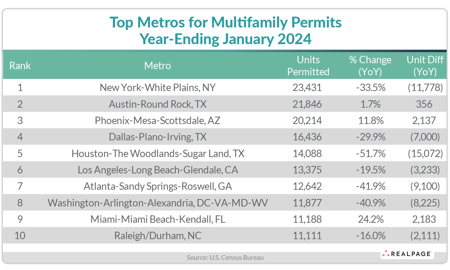 Other major non-top 10 markets with significant declines in permitting include San Antonio (-6,230 units), Minneapolis/St. Paul (-6,226 units), Seattle (-6,214 units), Tampa (-4,528 units), Boston (-3,386 units), Denver (-3,131 units) and Fort Worth (-3,119 units).