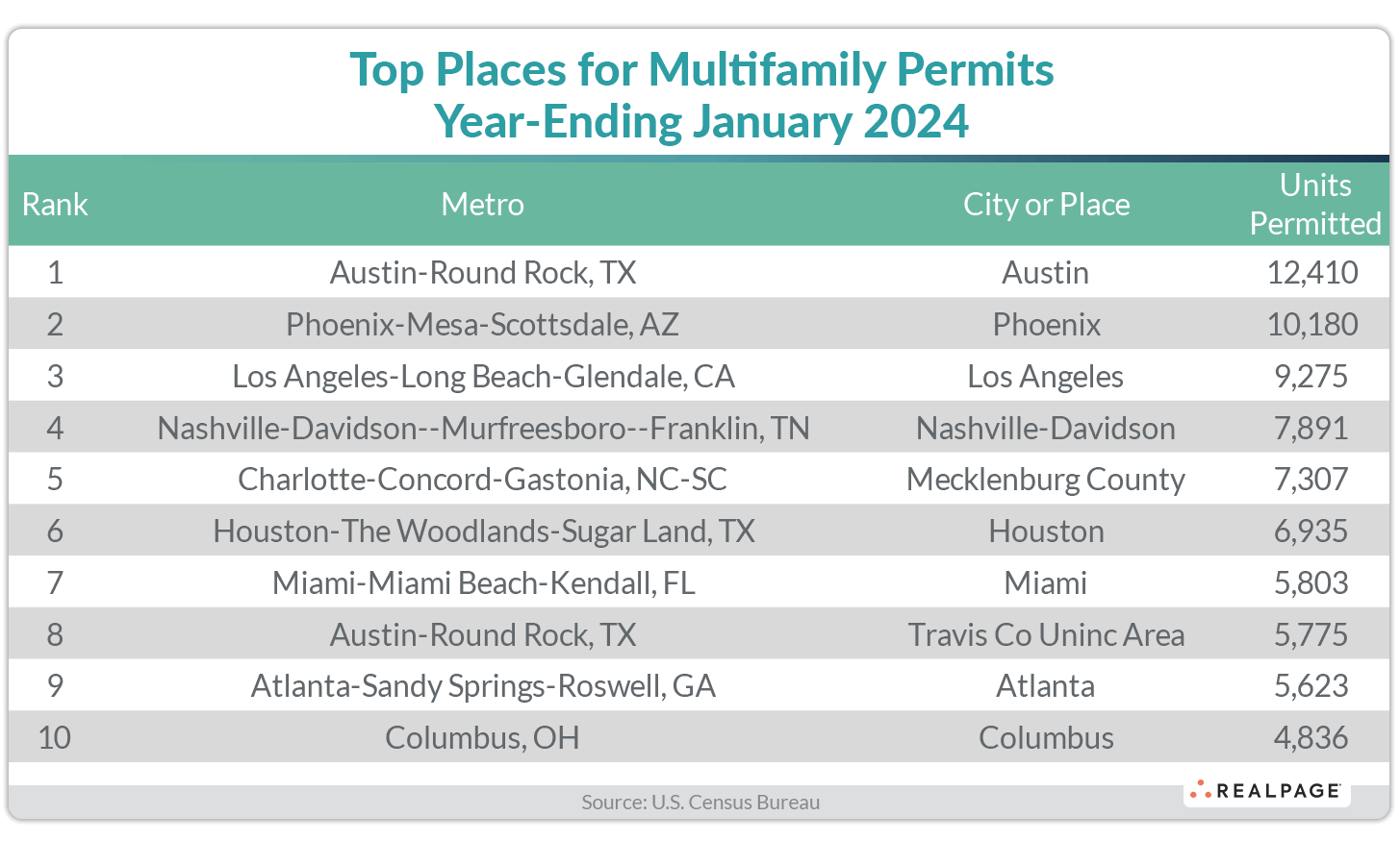 The city of Atlanta slipped two spots to #9 with 5,623 units permitted, down 761 units from December’s annual total, while the city of Columbus joined the top 10 with 4,836 units permitted, up 646 units from December.
