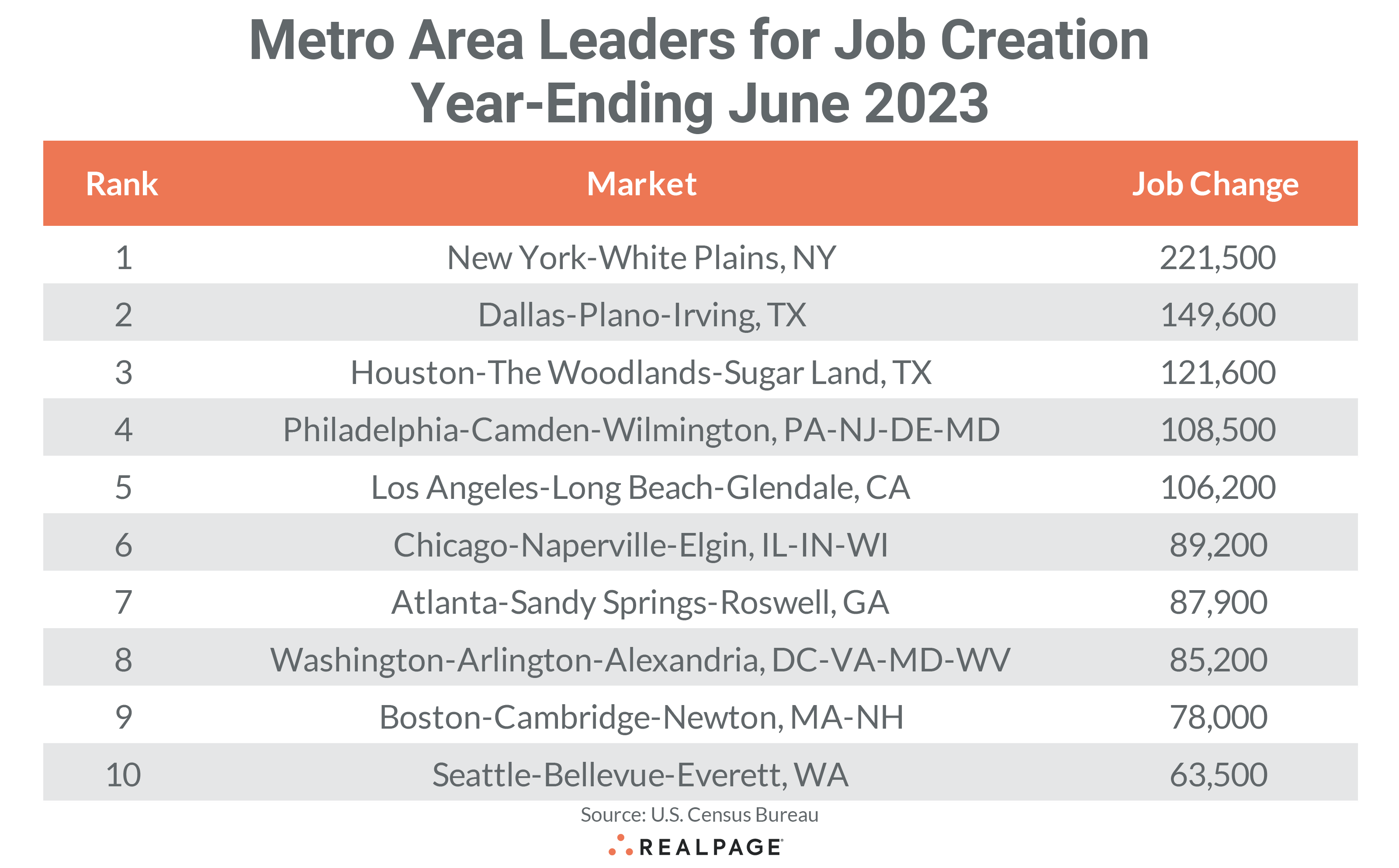 Altogether, the top 10 markets created 106,500 more jobs in the 12 months ending in June than the same period through May, an increase of 10.6%. This is on top of the fact that the majority of top 10 markets had their annual job gain figures for May revised upward slightly.