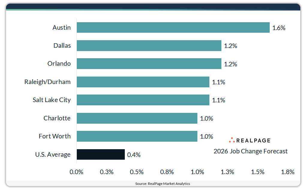 Among the nation’s 50 largest apartment markets, 27 are expected to see job growth above the U.S. average of 0.4% in 2026. Of those 27 markets, 20 are in the Sun Belt. Salt Lake City was the only major market outside the Sun Belt with forecasted employment growth greater than 0.7%, with an expected increase of 1.1%, according to data from RealPage Market Analytics. Austin is expected to record the fastest job growth in the nation among major markets. In addition to Austin’s forecasted employment expansion of 1.6% in calendar 2026, several other Sun Belt markets are also set to post solid job gains. Dallas and Orlando are expected to see employment grow by 1.2%, while Raleigh/Durham is set to match Salt Lake City’s forecasted job growth of 1.1%. Charlotte and Fort Worth should both see job growth of 1% in calendar 2026. On the other hand, the weakest job change performances among the nation’s 50 largest markets are expected in Baltimore, Detroit, Pittsburgh and Washington, DC, which are all forecasted to see essentially no change in their respective job counts in the coming year.