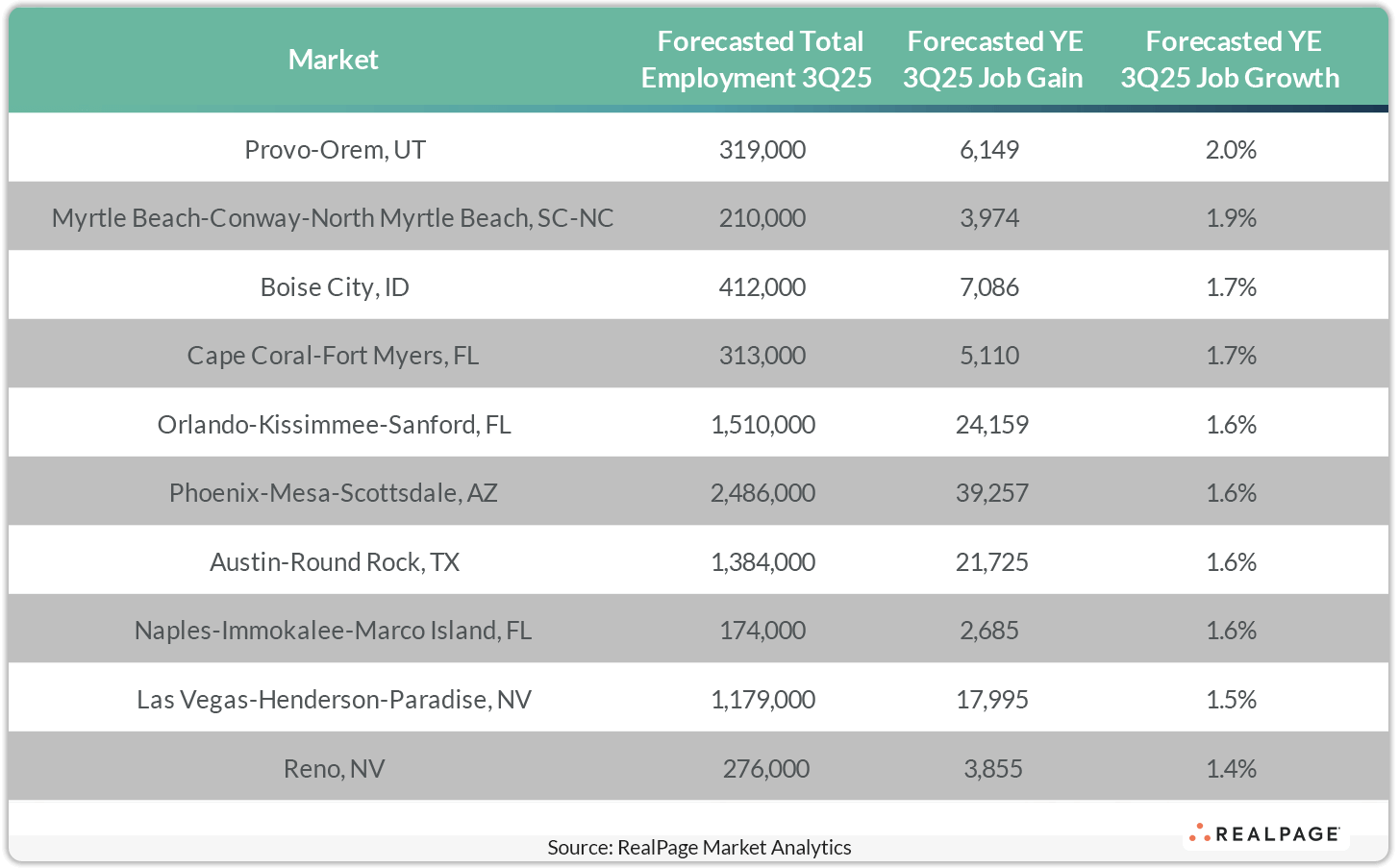 Among the markets set to see the nation’s most significant job growth in the coming year, West and South region markets dominate the list. Provo is slated to see the most job growth nationwide in the year-ending 3rd quarter 2025, with a 2% increase in its job base, according to RealPage Market Analytics. Among the South region markets on the job growth leaders list, most are in Florida. Job growth is forecasted to hit 1.9% in Myrtle Beach in the coming year, while Cape Coral should see 1.7% growth, and Orlando and Naples are likely to grow by 1.6%. The market on this list with the biggest job gain numbers slated for the coming year is Phoenix, with 39,257 new jobs slated to increase the existing job base by 1.6%. Of note, all these markets are forecasted to see job growth nearly double the national average of 0.9%.