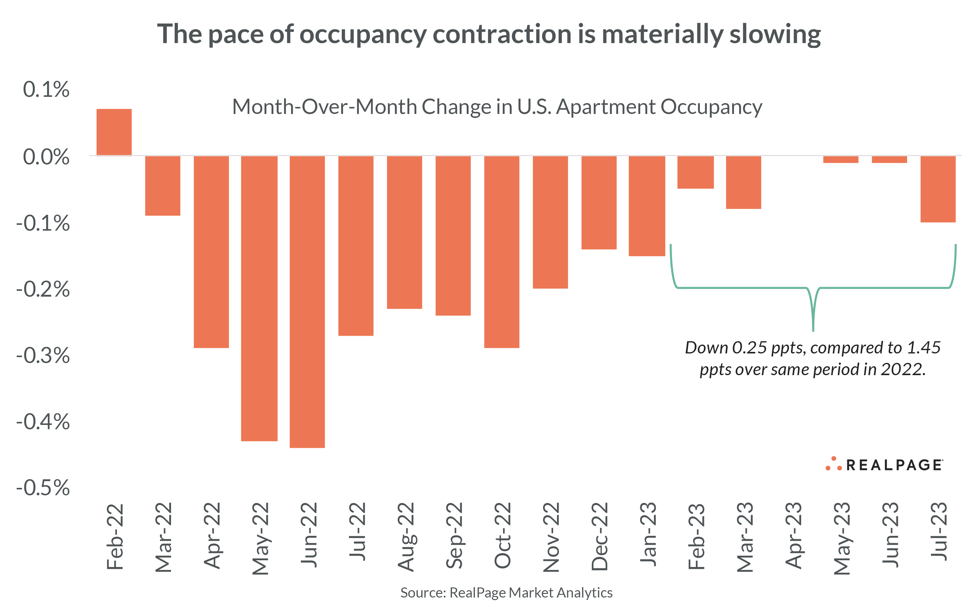The rent trends show that apartment operators continue to prioritize occupancy, given the high-supply environment. That strategy is paying off, as occupancy rates have held stable through the first seven months of 2023 after plunging from record highs back to more normal levels in 2022.