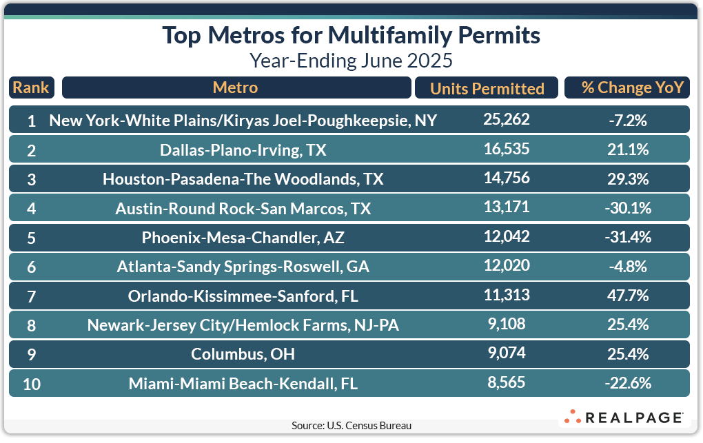 Nine of last month’s top 10 markets for multifamily permitting returned in June with the top five remaining in order. New York, Dallas, Houston, Austin and Phoenix were again at the top in total units permitted for the year, but compared to their annual totals one year ago, Dallas and Houston have increased while New York, Austin and Phoenix have slowed sharply.
