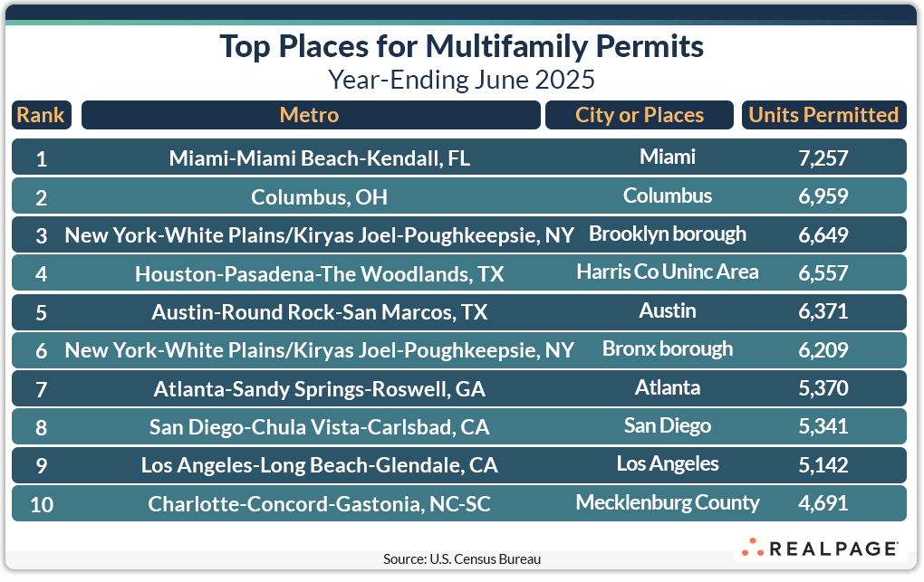 With a surge of almost 2,500 units in June alone, the city of Miami leapt to the #1 spot for annual multifamily permitting by place from #7 in May. The city of Columbus returned at #2 with almost the same level of annual units permitted as last month. The borough of Brooklyn fell two spots and Unincorporated Harris County (Houston) moved up one spot as the city of Austin slipped to #5 to round out the top five on this month’s list.