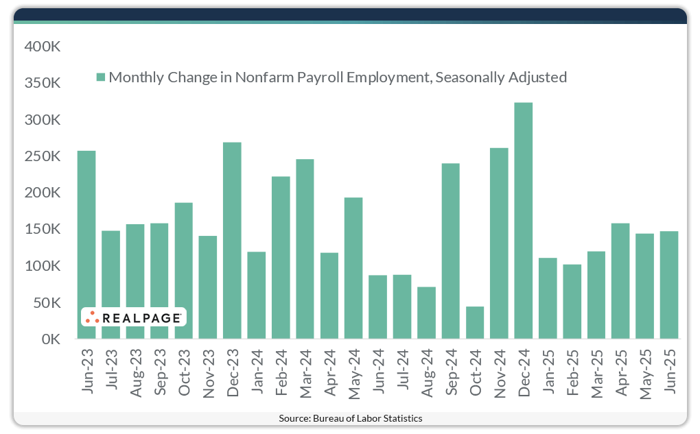 The U.S. labor market continued to persevere in June despite economic uncertainty. Employers added 147,000 workers to payrolls in June 2025, according to a survey of businesses by the Bureau of Labor Statistics. Those additions were up slightly from the 144,000 jobs added in May and were well above economists’ expectations of fewer than 118,000 job additions. Job gains in April and May were revised up by 11,000 and 5,000, respectively, equating to 16,000 more positions added than previously reported. The Government sector (+73,000 jobs) added the most jobs in June, led by increased hiring in State Government (+47,000 jobs) and Local Government (+33,000 jobs), while Federal Government (-7,000 jobs) continued to shed jobs. The Education/Health Services sector (+51,000 jobs) had the second-largest job increase during the month. Notable job losses were seen in Professional/Business Services (-7,000 jobs) and Manufacturing (-7,000 jobs). The only other major industries to lose jobs during June were Other Services (-5,000 jobs) and Mining/Logging (-2,000 jobs). Meanwhile, the unemployment rate (U3 or headline unemployment rate, which is seasonally adjusted, and is a survey of households) has registered in the narrow range of 4% to 4.2% over the past 14 months and came in at 4.1% in June. That was down from 4.2% in May and below expectations of 4.3%.
