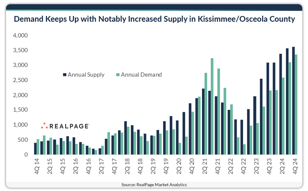 Orlando’s Kissimmee/Osceola County had one of the fastest growing apartment inventories across the nation in calendar 2024.