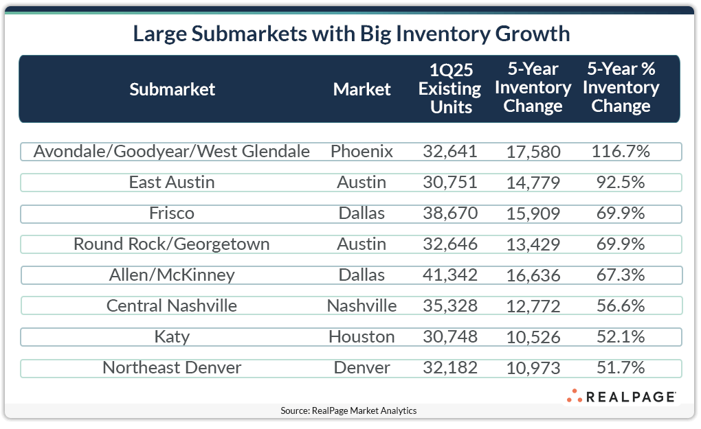 Eight large submarkets nationwide have seen their existing apartment count increase by 50% or more in the past five years.
