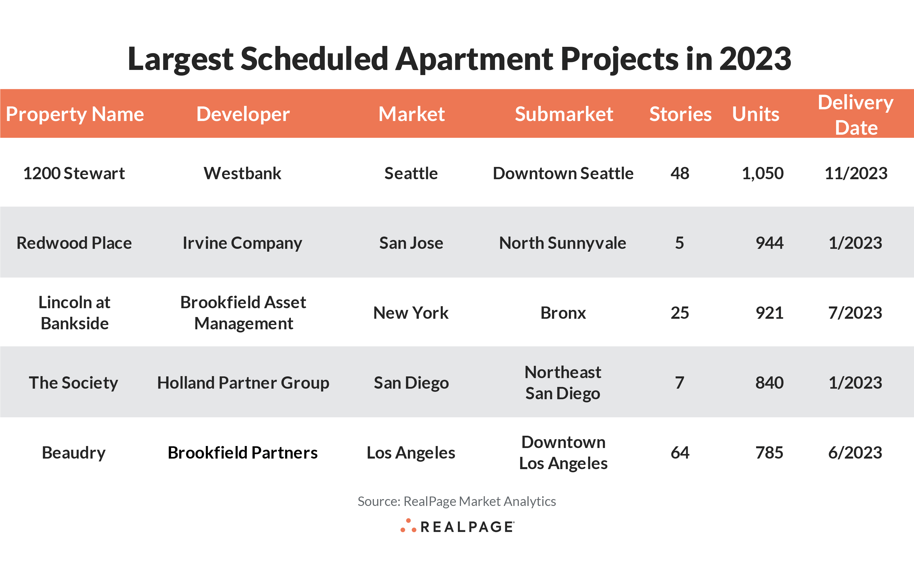 The U.S. apartment market is on track add nearly 3,300 communities containing roughly 590,000 units in 2023. That is the largest delivery volume since RealPage began tracking the U.S. apartment market 30 years ago. The large number of units coming online next year is boosted by some massive individual projects. The five largest conventional apartment projects scheduled to deliver in 2023 are being built on the east and west coasts and all of them are mid- to high-rise communities.