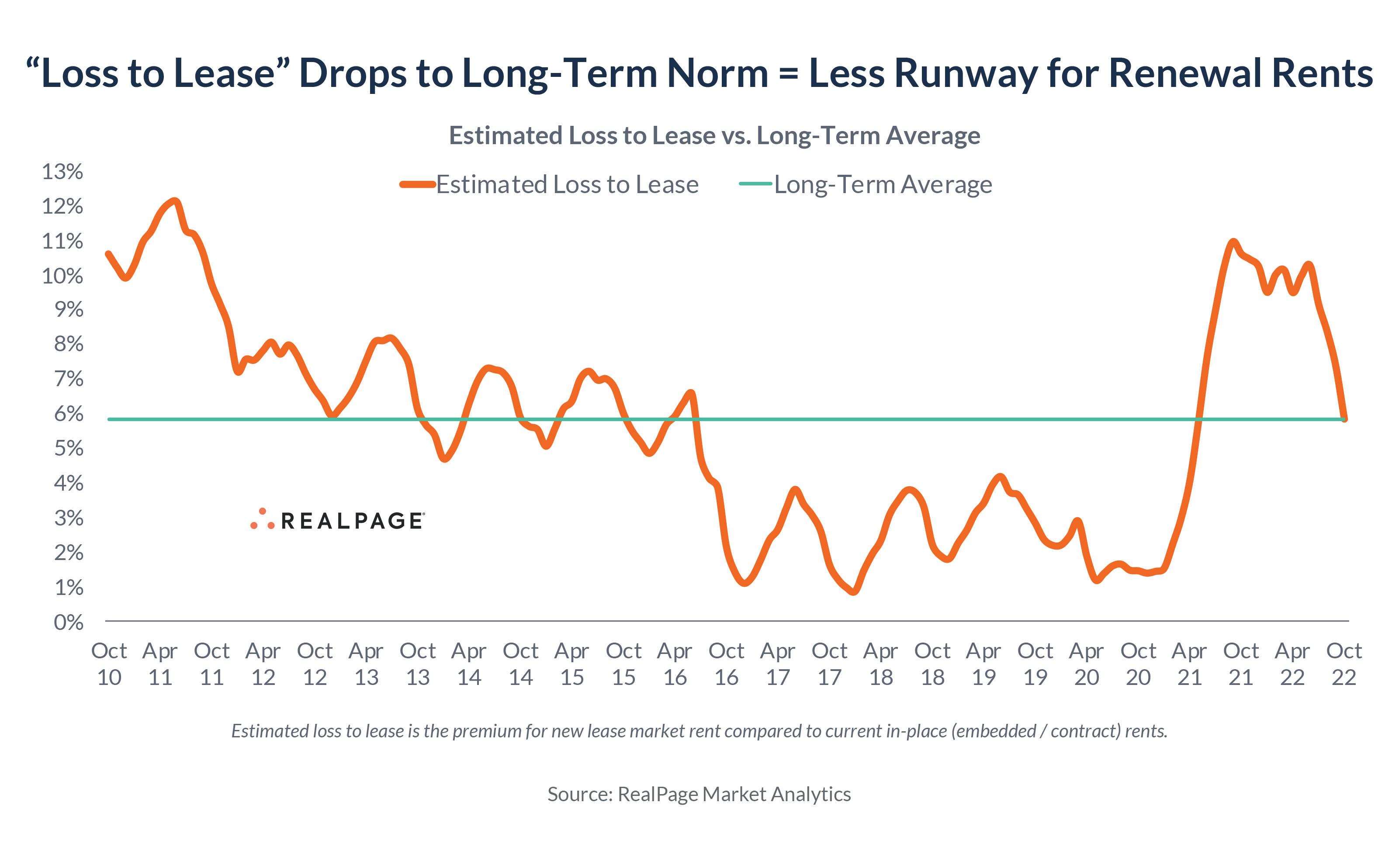 It’s critical to acknowledge there is ALWAYS some loss to lease because there’s usually a discount for renewals relative to new leases. (It’s equally important not to misinterpret this to mean renewal rents won’t increase as new leases decrease. This just means the nominal rent value paid by a renewing renter is almost always below what a new renter would pay coming through the front door.)