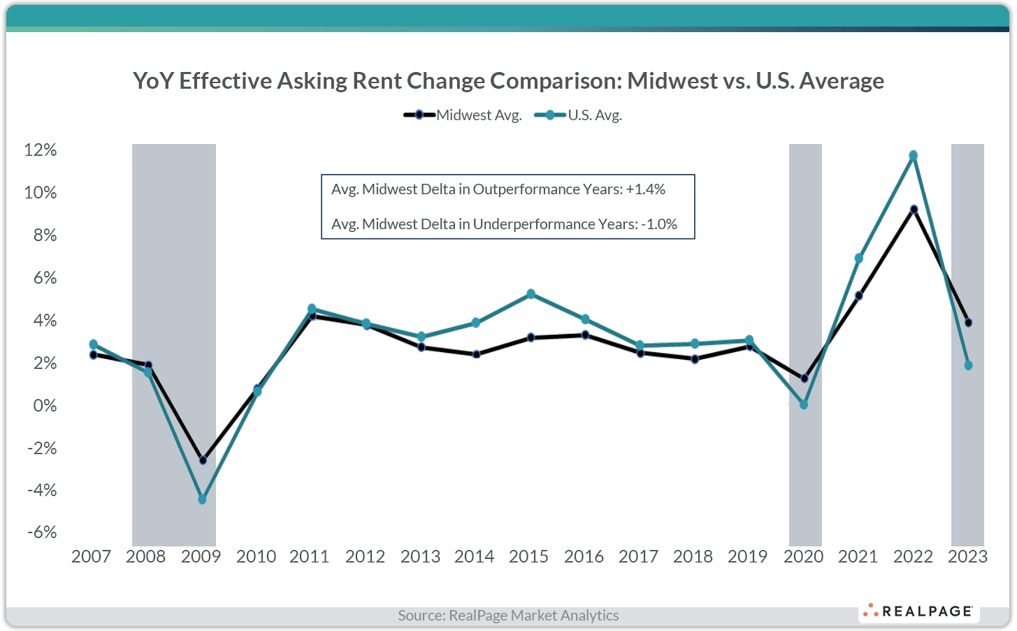 Midwest rent growth outpaced the national average in 2023, for only the fourth time in almost two decades. The typically stable apartment industry in the Midwest tends to shine in moments when the U.S. overall does not. That was the case in 2023, as the U.S. logged annual rent growth at modest 0.3% while the Midwest saw more success with price increases of more than 2%. Over the past 17 years, there have only been three other times when Midwest rent growth outpaced the U.S. average, and in all of those cases, the U.S. apartment market was either experiencing a down year or was right on the cusp of one. During these down years the Midwest averaged a performance premium of about 1.4% over the U.S norm.