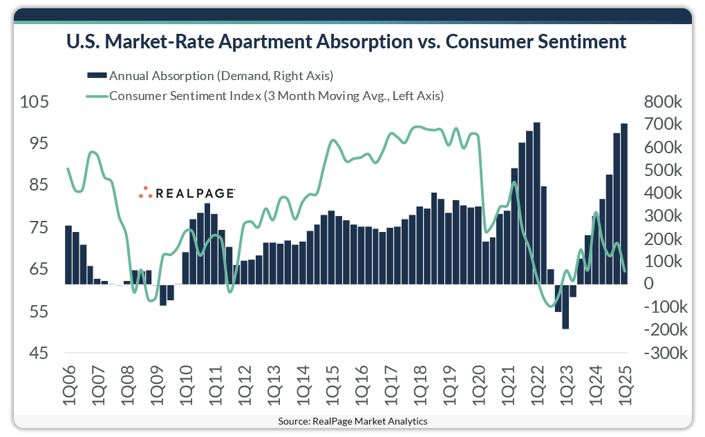 The one place our aim really missed was in consumer sentiment. The year started with strong and improving consumer sentiment in January. But the tariff-related volatility in the stock market weakened consumer expectations by the end of 2025’s 1st quarter. In good news, apartment demand has not yet felt the impact of declining sentiment, but this could be a warning that some softening is coming later this year.