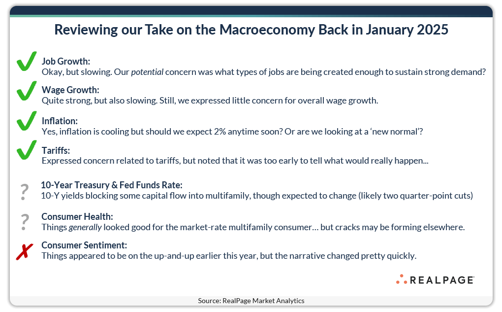 Back in January, RealPage economists made predictions about the economic landscape of 2025 and its effects on the apartment market. Let’s take a look at how those forecasts have panned out so far in 2025.