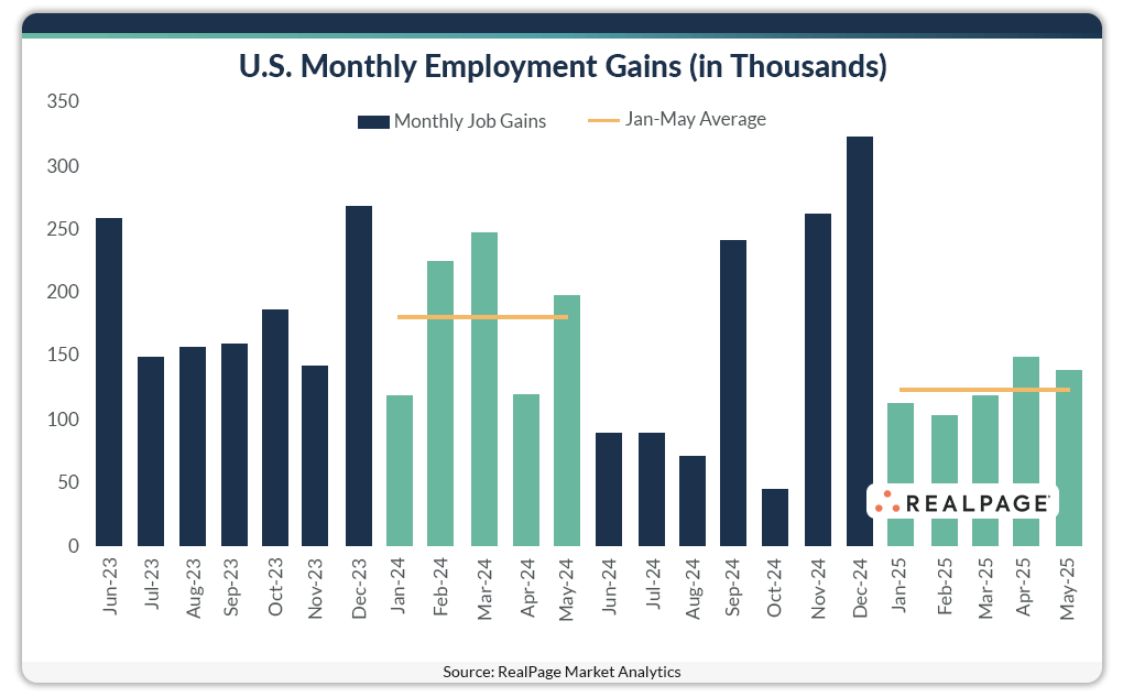 As a driver of apartment demand, moderating job growth was a concern going into 2025. In the first five months of the year, job growth definitely slowed, though jobs are still being added at a relatively steady pace. Sectors losing the most jobs as of May were Manufacturing and Other Services, while Education/Health Services added the most employees to the workforce.