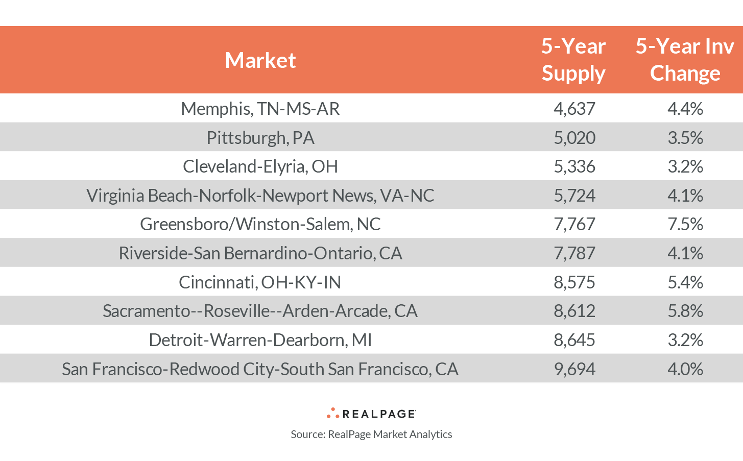 In a time dominated by record-breaking supply volumes across the U.S., a handful of major apartment markets have gone against the grain, adding less than 10,000 new units in the past five years. Among the nation’s largest 50 markets, Memphis has added the fewest new apartments since 2018, gaining just 4,600 or so units, increasing the existing base by 4.4%, according to 3rd quarter data from RealPage Market Analytics. Adding roughly 5,000 to 6,000 new apartments in the past five years were Pittsburgh, Cleveland and Virginia Beach. Greensboro and Riverside saw the completion of roughly 8,000 units in the past five years. Two other California markets made this list of low supply markets. Sacramento logged additions of just over 8,600 units, while San Franciso completions totaled nearly 9,700 units. Rounding the list out were two Midwest markets: Cincinnati and Detroit both gained about 8,600 new apartments in the past five years. It’s not a surprise to see some apartment markets on this list. Detroit, Pittsburgh and Cleveland saw their employment counts decline notably in the past five years, when the norm nationwide was job growth. Occupancy declines since 2018 have been significant in Memphis, Greensboro, Detroit, Sacramento and Riverside. But when it comes to rents, which are forging a relationship with supply volumes, all the metros on this list – with the exception of the California markets – are logging price growth at or above national norms.
