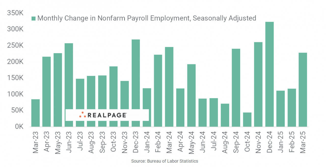 U.S. employers added twice the number of jobs in March than they did during the first two months of the year, but annual gains remain below last year’s pace and behind pre-pandemic norms. Employers added roughly 228,000 workers to payrolls in March 2025, according to a survey of businesses by the Bureau of Labor Statistics. Those additions were double the average of 114,000 jobs added in January and February and were well above the roughly 130,000 to 140,000 job gains expected by economists. The U.S. economy has now added jobs for 51 consecutive months, the second-longest period of job base expansion on record dating back to 1939, following the 113-month stretch that ended with the onset of the COVID-19 pandemic. The Education/Health Services sector (+77,000 jobs) added the most jobs in March, while Information and Mining/Logging were the only major industries to lose jobs (both down by 2,000 jobs). Despite the loss of 4,000 Federal Government jobs in March (which followed 11,000 job cuts in February), the Government sector overall gained 19,000 jobs during the month. However, federal employees who have been placed on paid leave or severance by the Trump administration were still counted as employed. On an annual basis, U.S. employers added roughly 1.88 million jobs or an average of nearly 157,000 jobs per month. That annual gain was down from the nearly 2.4 million jobs added a year earlier and registered below the pre-pandemic average of 2.4 million from 2015 to 2019. Meanwhile, the unemployment rate (U3 or headline unemployment rate, which is seasonally adjusted, and is a survey of households) rose from 4.1% in February to 4.2% in March.
