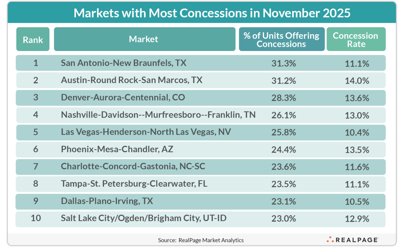 Apartment operators leaned heavily on concessions in November, but some markets were more impacted by others. In November, 16% of stabilized apartments nationwide offered concessions, with average discounts climbing to 10.2% – the highest since September 2024, RealPage Market Analytics reports. Still, those topline U.S. metrics were skewed by performance in the South region, where 20.1% of properties offered concessions, followed by the West Coast at 15.3%. Usage in the high-supply South was nearly double that of its Northeast (11.6%) and Midwest (10.7%) peers. These findings were evident at the market level as well. Among the largest 10 apartment markets ranked by concession usage, six were in the South and the remaining four were in the West. All ten markets offered double-digit discounts in November, with Austin posting the highest concession rate among large markets nationwide.