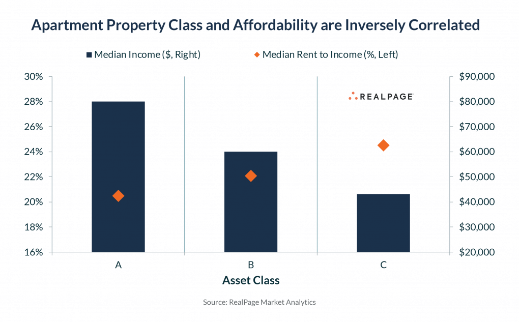 In the luxury Class A sector, the median rent-to-income ratio measured 20.5%. That compares to 22.1% in the middle-rent Class B segment and 24.5% in the lowest-price Class C properties.