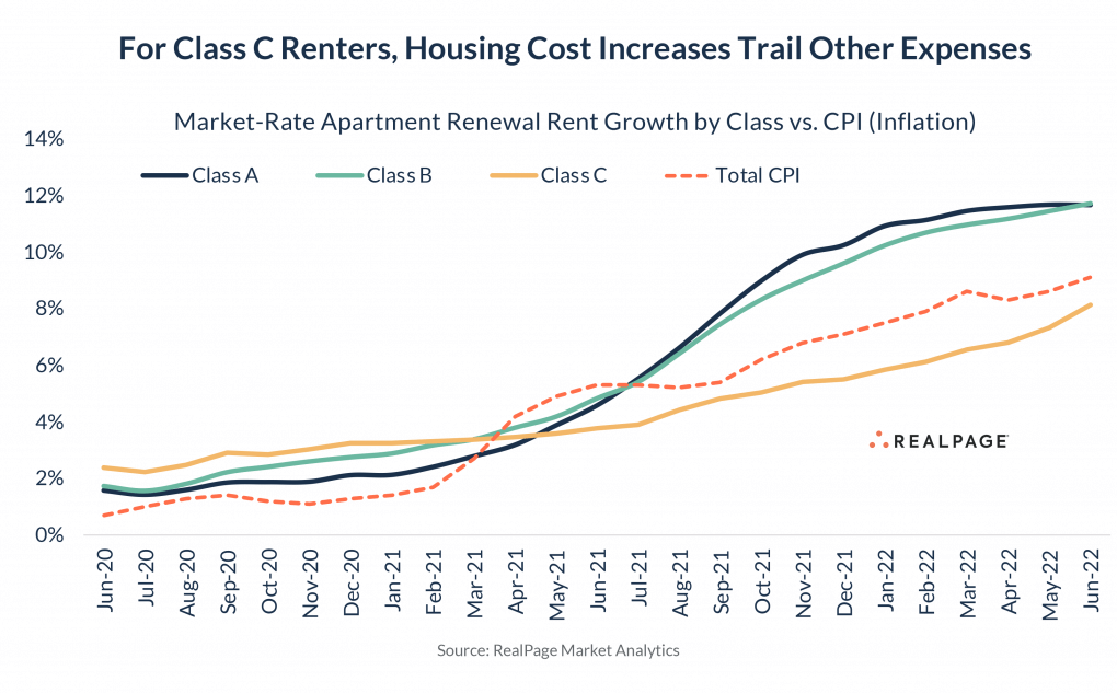 And for those reasons, rents in Class C have grown slower than Class A or B – and that’s especially true upon renewal. Renewal rent increases in Class C have consistently registered below the headline Consumer Price Index (CPI), meaning a Class C renter’s housing costs are growing at a slower rate than their other expenses. As of June 2022, Class C renewal rent increases averaged 8.1%. That compares 9.1% headline inflation and renewal increases of around 11.5% in Class A and Class B apartments.