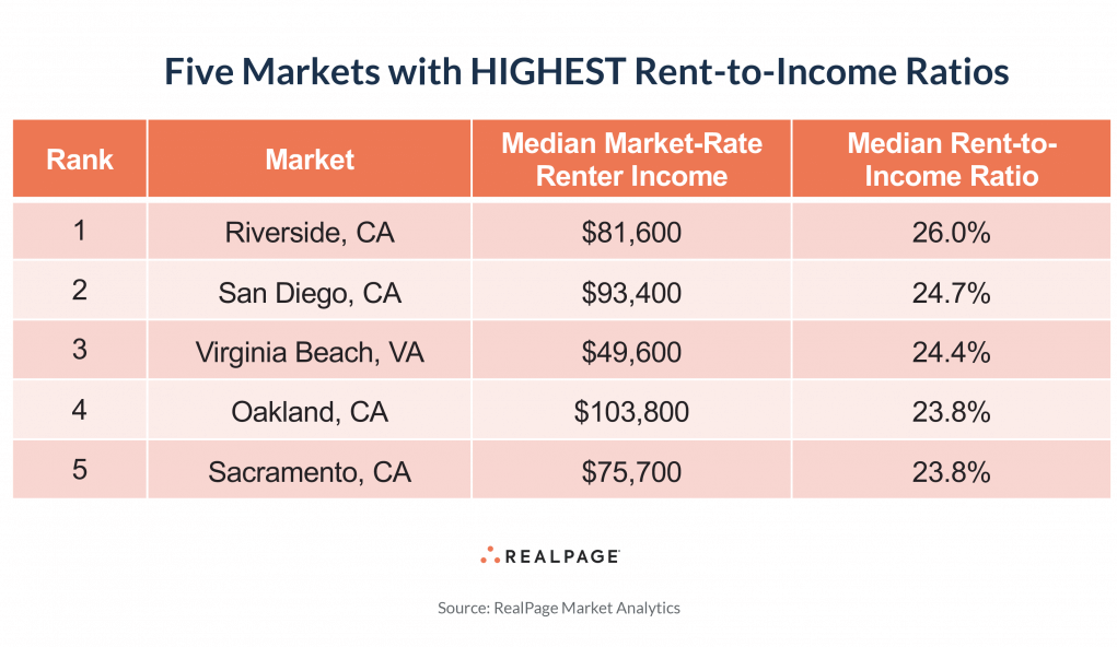 Apartment rents vary dramatically across the country, but perhaps surprisingly, rent-to-income ratios do not. Rent-to-income ratios vary from a low of 18% in Pittsburgh to 26% in Riverside. The vast majority fall within the 20% to 25% range. That’s because of a wide range of incomes across markets.