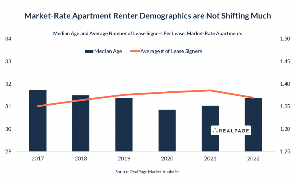 Among market-rate renters, one common theory on rising incomes has been that would-be homebuyers priced out of the for-sale market are landing in apartments, inflating the income numbers. There is no available dataset to test that theory directly, so instead, RealPage looked at the median age of apartment renters signing a lease. If that theory were true, it could be assumed that median renter ages were increasing – as renters stayed in apartments longer with the benefit of larger incomes as they advanced in their careers. But that theory did not hold up. The median adult age of apartment renters actually dropped from 31.4 in 2019 to 31.0 in 2021 before returning back to 31.4 in 2022. Median age also held consistently between 31 to 32 in the years before the pandemic.
