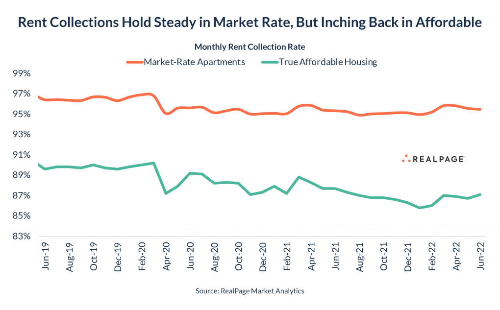 The stark differences in collections between market-rate and affordable housing show the bifurcated impact of inflation. Rising expenses (including rent increases) have so far had little impact on market-rate rent collections. But in affordable housing (where changes in rent can vary by program but generally increase much less than market rate), it’s a different story. That could suggest renters in affordable housing are struggling with other expense increases (like food and gas) and therefore have less money available to pay rent.