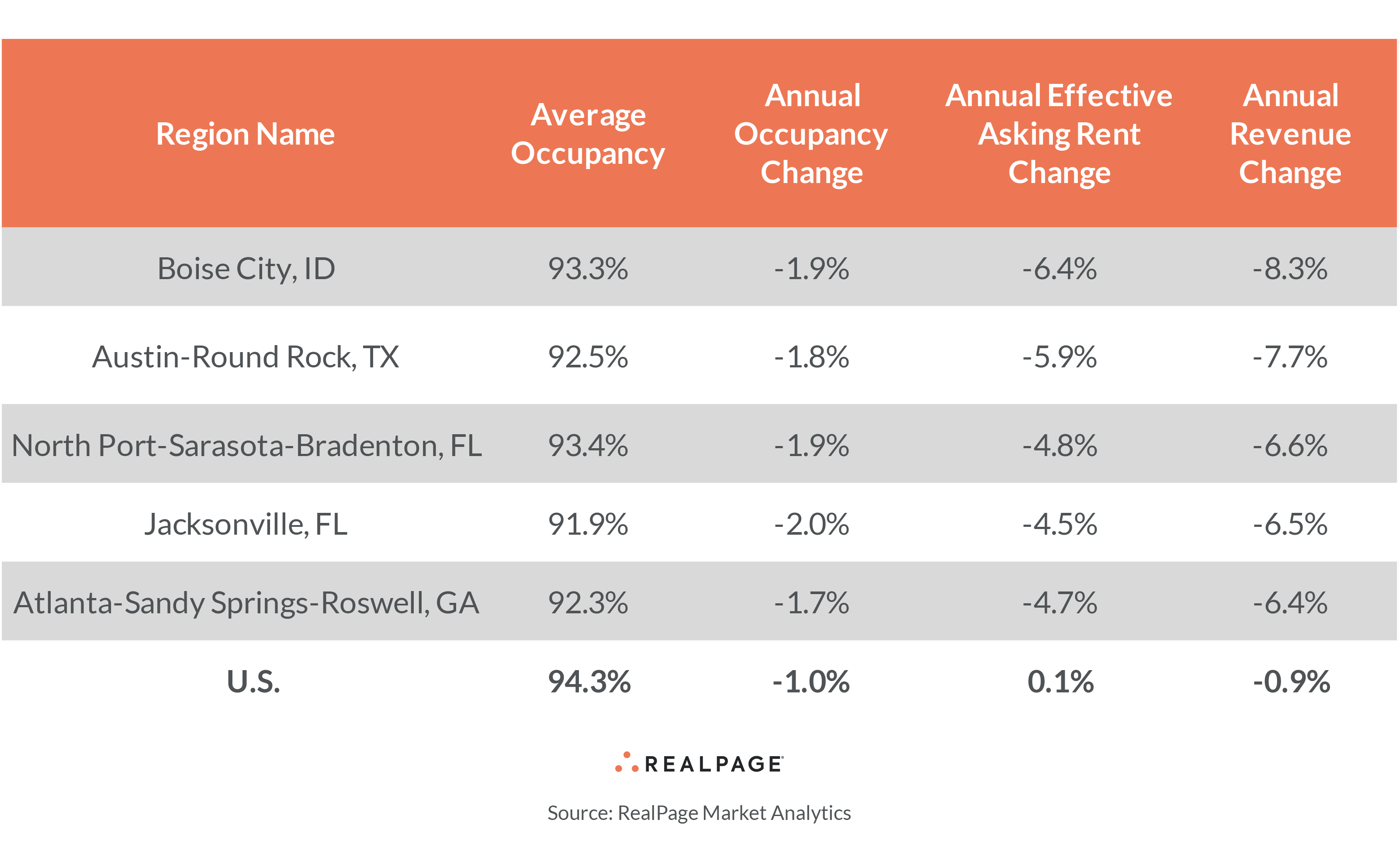 On the northern end of the state, Jacksonville, FL saw revenue drop 6.5% for the year-ending October as rent change fell 4.5% and occupancy slid 2%. New supply was the story here too as inventory growth was solid at 5.4% or a little more than 7,000 new units. Similarly, more supply is on the way with close to 9,000 new units set to deliver in the next 12 months, or 6.8% inventory growth. Like Boise, Jacksonville made the top 10 list for job growth in September at 3.9%.