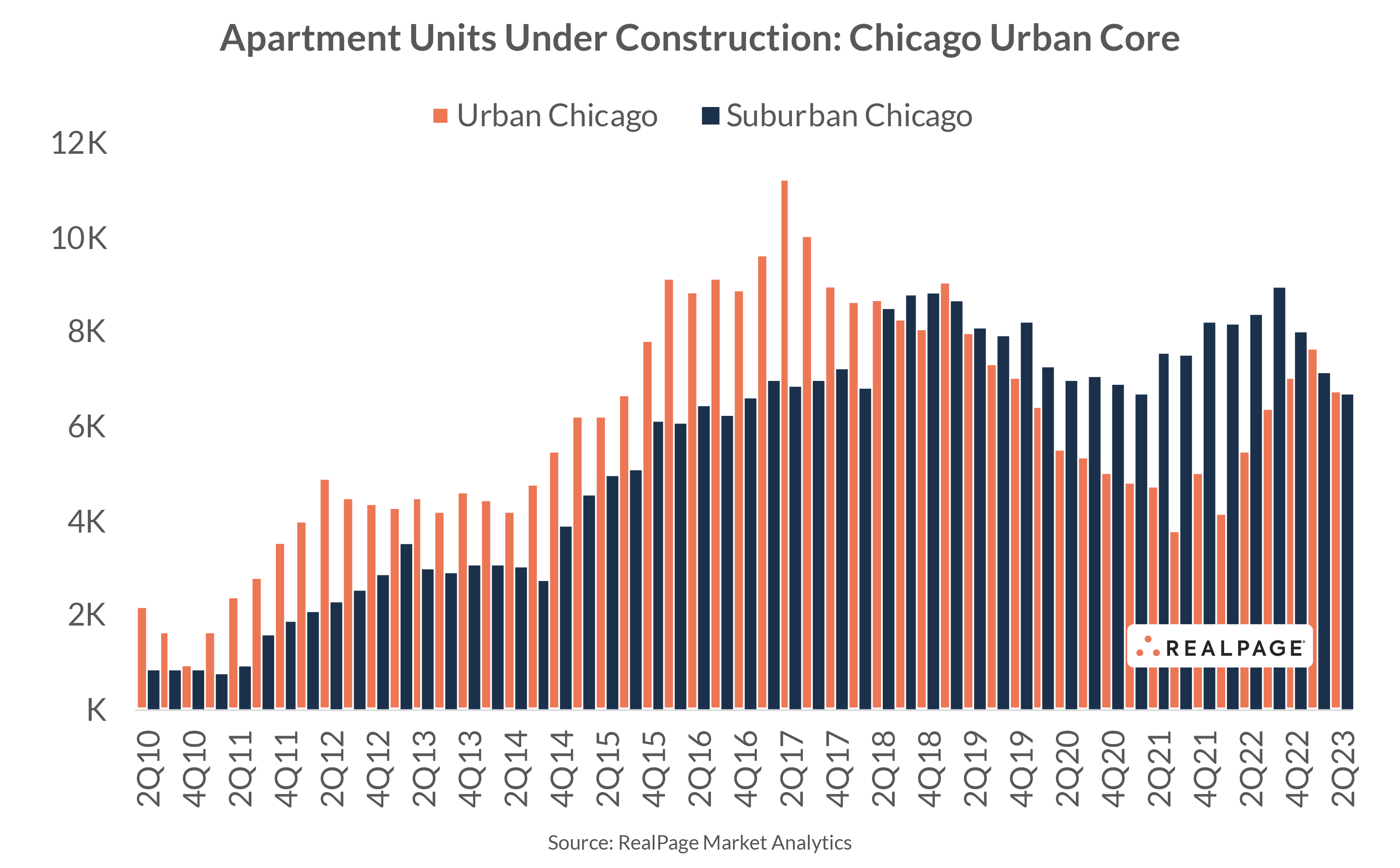 Today however, Chicago’s urban development pipeline has subsided to just 40% of its peak level. Meanwhile, construction in suburban Chicago has dropped off at a less pronounced rate and far more recently.