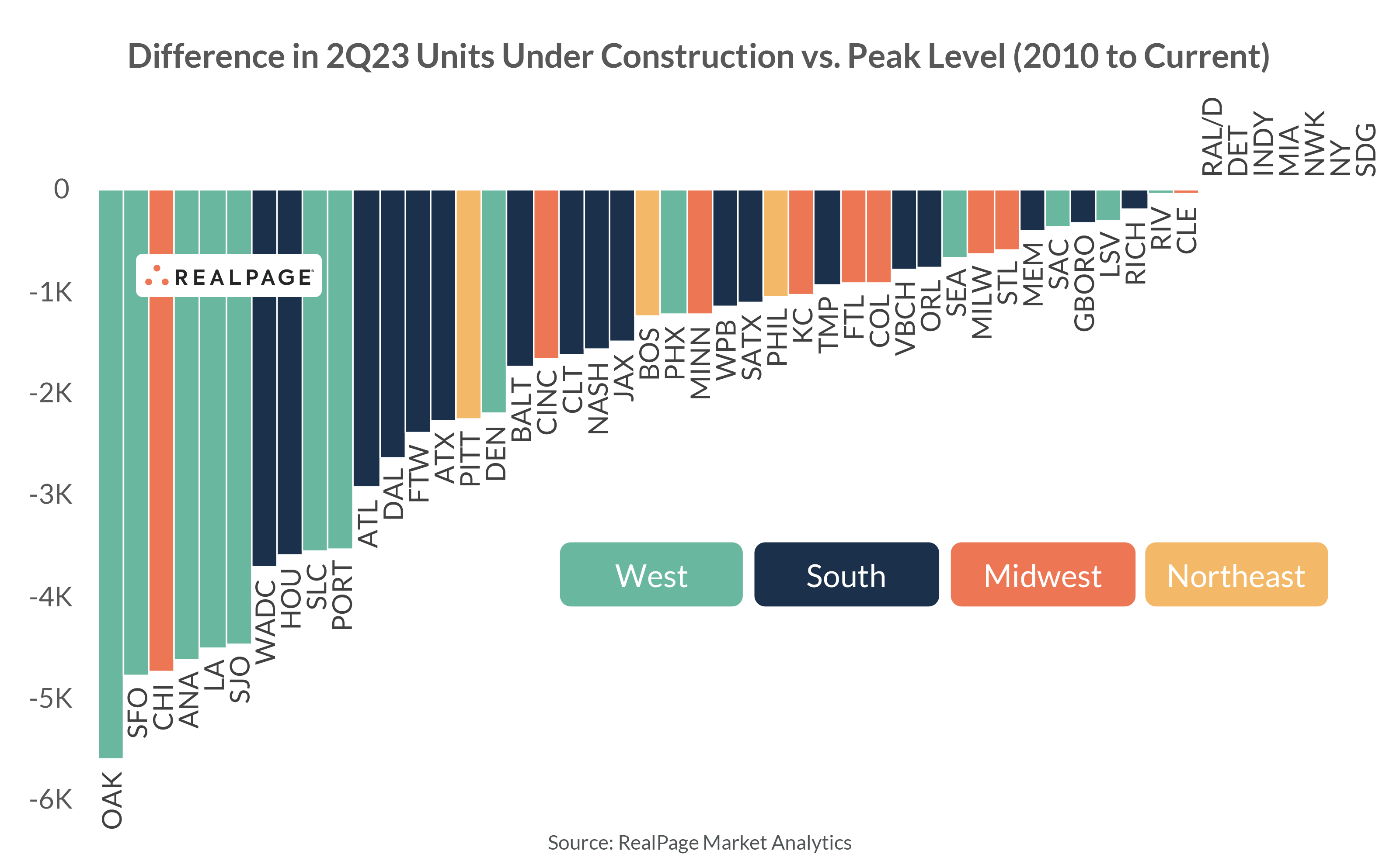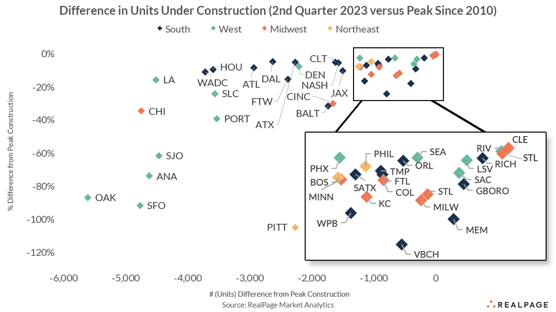 Interestingly, only one of those markets is in the South region (Miami), though a cumulative count of the South Florida trio (Miami, Fort Lauderdale and West Palm Beach) shows construction is down from 1st quarter 2023’s peak (from 46,328 units to 44,905 in 2nd quarter 2023). Arguably only Indianapolis (peaking about 800 units or 10% above its 1st quarter 2023 figure) boasts a noteworthy increase in the 2nd quarter figures.