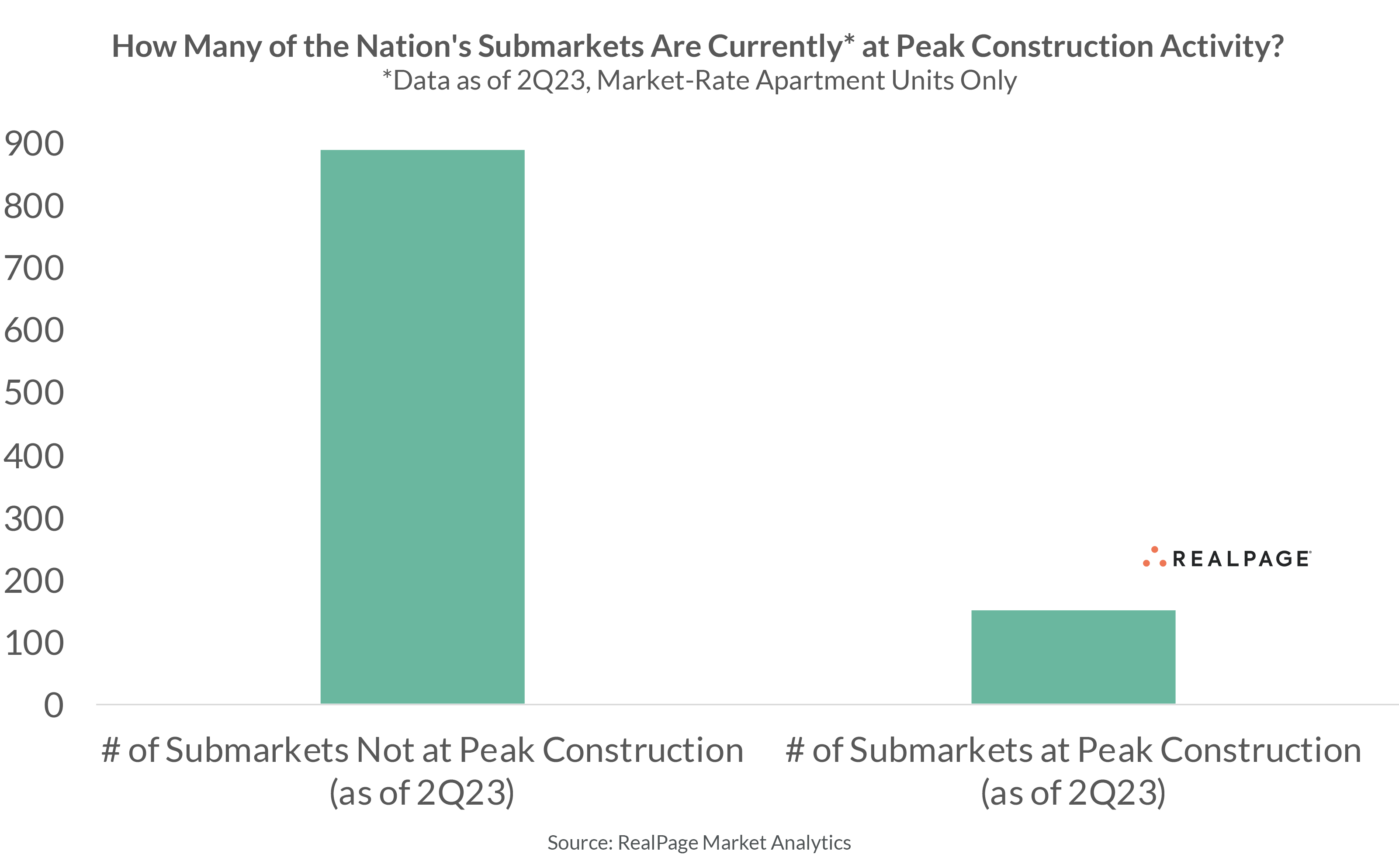 Considering that construction has peaked in nearly half of the nation’s top 50 metros in the first half of 2023, it may come as a surprise that the share of submarkets at peak construction is significantly smaller. In fact, just 150 of the nation’s 1,039 submarkets as classified by RealPage Market Analytics are currently at peak construction – less than 15%.