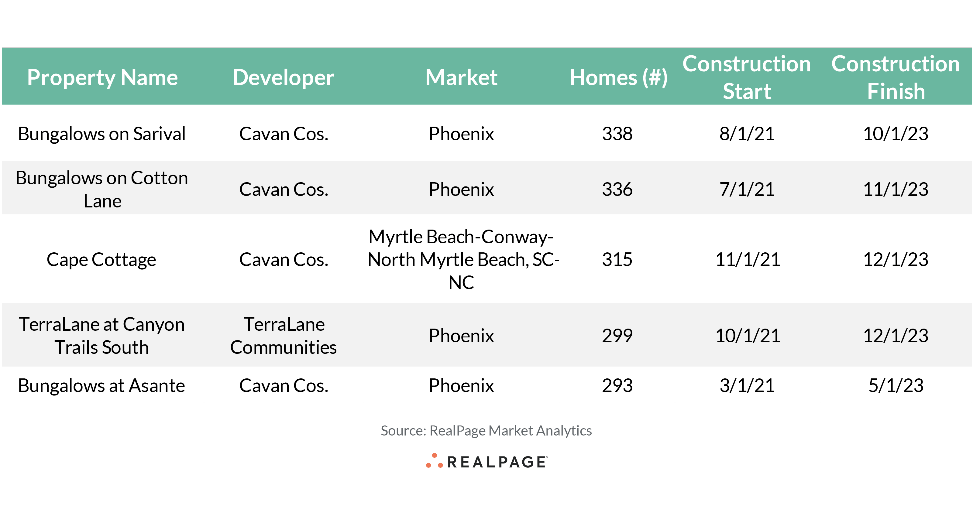When examining the largest BTR properties under construction across the 150 largest apartment markets, roughly 15,100 BTR units are expected to complete by the end of 2023. Of that number, here are the five largest projects underway, scheduled to wrap up construction by the end of the year. The density of these projects hovers around 300 units per property.