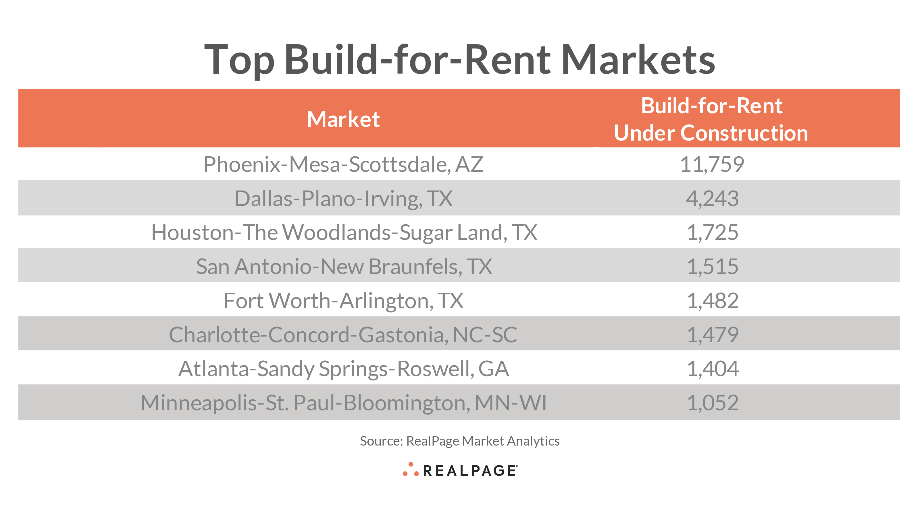 Other notable performers in the BTR space are other Texas markets Houston, San Antonio and Fort Worth, which have emerged as construction hotspots with between 1,400 and 1,700 units underway.