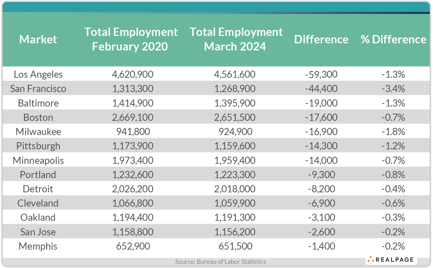 Despite deep losses during the early months of the pandemic, the nation at large has grown total employment approximately 4% since February 2020. However, not all markets have totally recovered all the job losses seen during that decline. Los Angeles total employment sits nearly 60,000 jobs below its pre-pandemic employment rate, marking the most severe decline nationwide and translating to a job base that is 1.3% below the pre-COVID norm. San Francisco claims the worst relative difference, with total employment 3.4% behind February 2020 levels, equating to nearly 45,000 fewer jobs in March 2024. Two other California markets – Oakland and San Jose – also made the list of markets that haven’t recovered from pandemic-era job losses. Notably missing from this list are any Sun Belt markets, with the slight exception of Memphis, where March employment was just 1,400 jobs below its pre-pandemic total, according to the latest metro-level data from the Bureau of Labor Statistics.