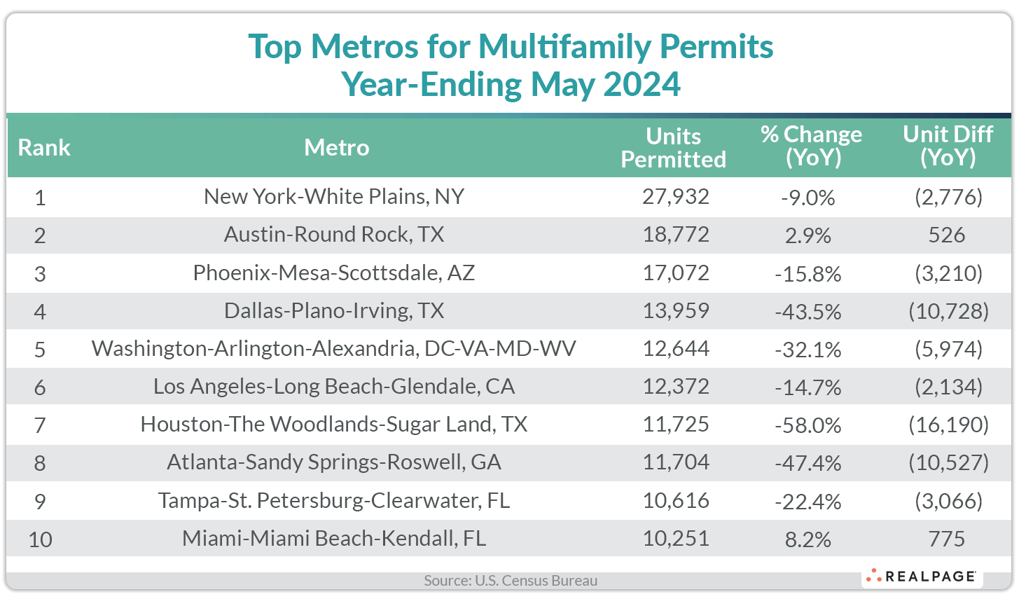 New York remained the top multifamily permitting market in the 12-months-ending in May with 27,932 units permitted, down about 9% from a year earlier and down almost 3% from April. Austin returned at #2 with 18,772 units permitted, up about 3% from last year but down almost the same amount from the previous month.