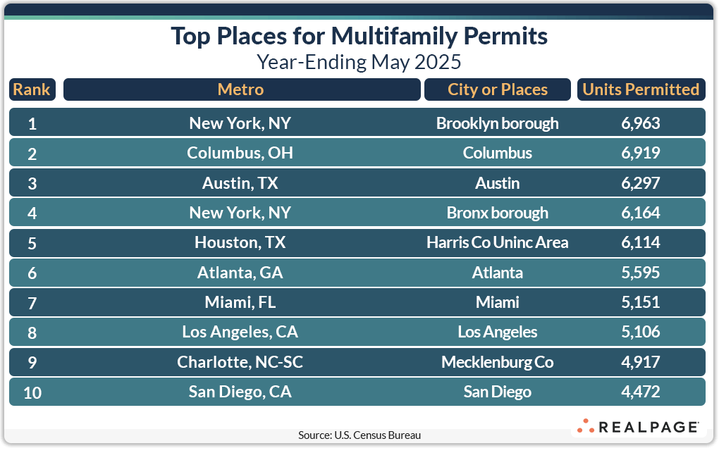 Last month’s #1 – the borough of Brooklyn – returned at the top of May’s list but reduced their annual multifamily permitting by about 300 units. The cities of Columbus and Austin each moved up, increasing permitting totals by more than 1,000 units each over last month. The Bronx borough moved up three spots with an almost 1,000-unit increase and Unincorporated Harris County (Houston) remained in the #5 spot.