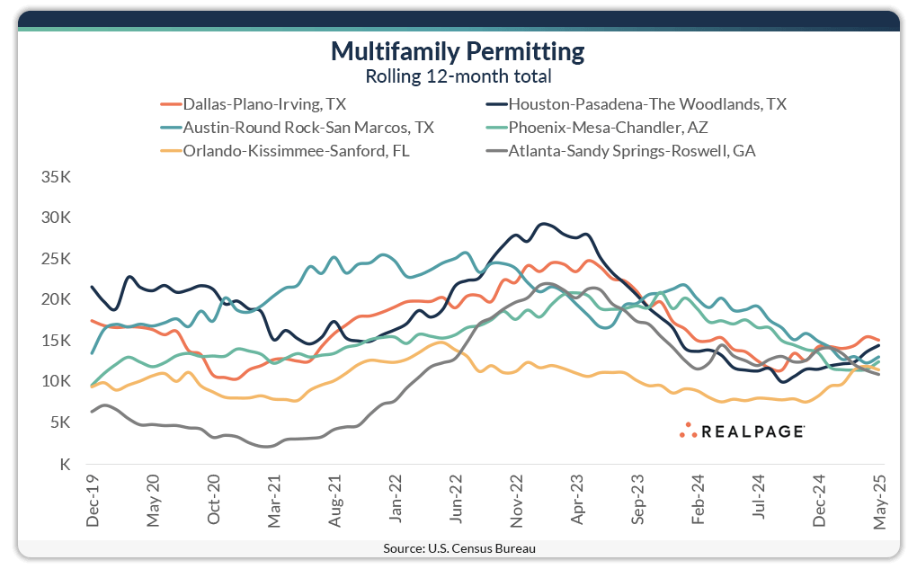 Two of the nation’s top apartment development markets – Dallas and Houston – have seen their annual multifamily permitting totals increase each month since September 2024. Orlando began increasing in November. Austin and Phoenix didn’t begin slowing until early 2024 and may not have reached bottom yet, but both had slight upticks in their annual permitting totals in May compared to April. Atlanta is another market where the annual permitting trend is difficult to call a trough.
