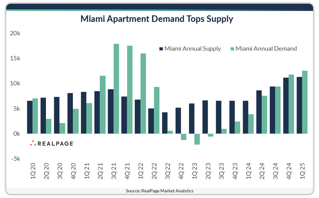 Helping boost apartment occupancy in Miami in recent years, demand has pushed ahead of high supply volumes. In the year-ending 1st quarter 2025, Miami absorbed over 12,500 units, pushing ahead of concurrent supply volumes by over 1,200 units.