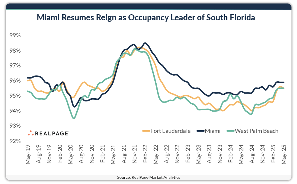 As of May 2025, Miami had occupancy of 95.9%, making it the only South Florida market with a rate ahead of the U.S. average. Occupancy was a bit lower at 95.5% in both Fort Lauderdale and West Palm Beach.
