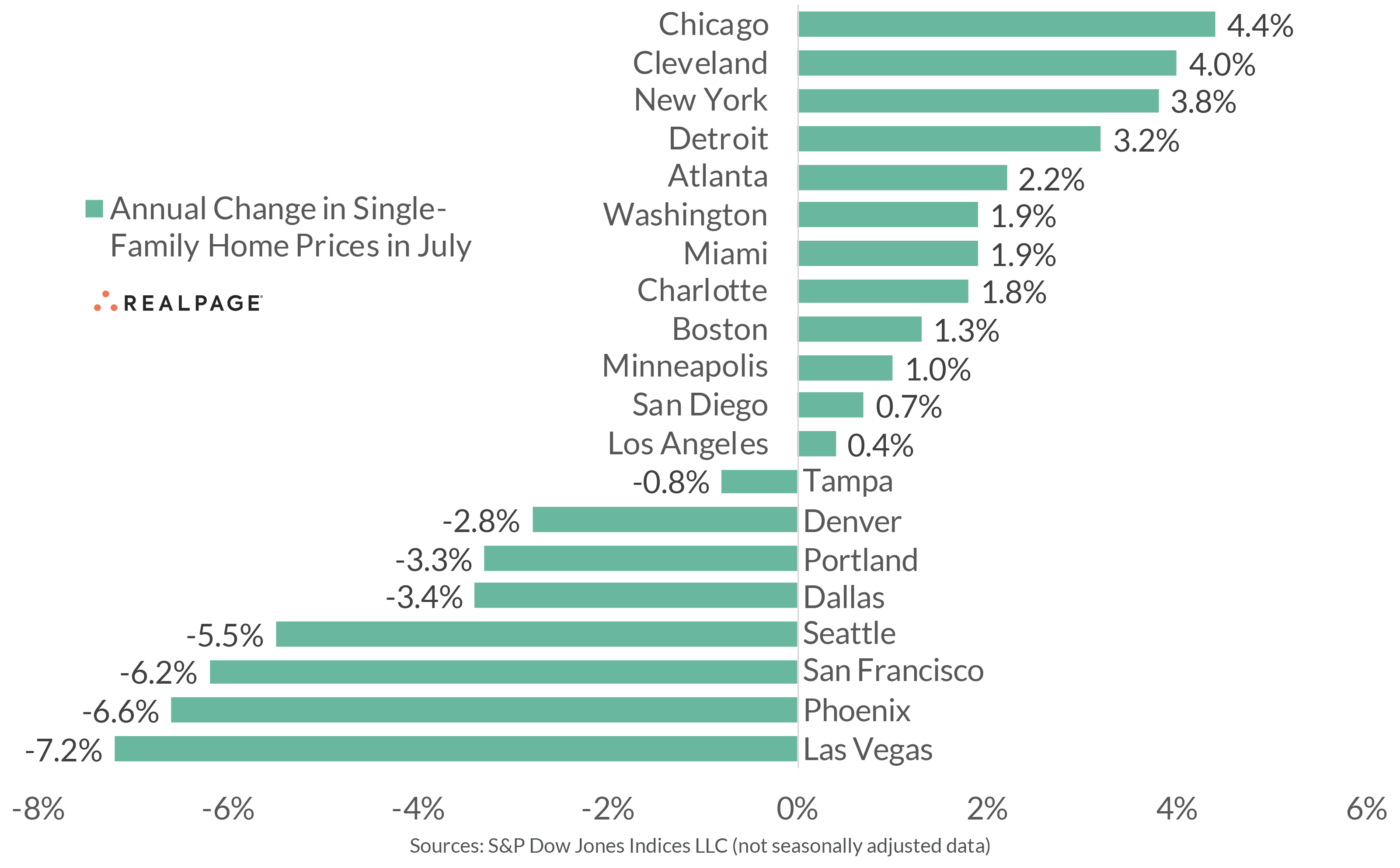U.S. home prices continued to rise in July amid historically low levels of inventory. More than half of the markets tracked recorded an increase in prices over the past year, led by two Midwest markets. Meanwhile, some West region markets saw deep annual price declines. Overall, U.S. home prices were up 0.6% from June to July, according to the seasonally unadjusted S&P CoreLogic Case-Shiller U.S. National Home Price Index, which measures average home prices across the nation. That was the sixth month in a row prices have increased. On an annual basis, home prices were up 1% as of July 2023. While that was the largest year-over-year increase in five months, it was well below the historic peak of 20.8% from March 2022. Looking at more granular results, the S&P CoreLogic Case-Shiller 20-City Composite Index, which tracks prices in the 20 largest metros, posted a 0.6% month-over-month gain and 0.1% growth year-over-year. As of July, 19 of the 20 cities in the index reported month-over-month price increases, with only Portland (-0.2%) recording a slight pullback. The largest monthly increase was in Las Vegas (1.1%), followed by Cleveland and Phoenix (both at 0.9%). On an annual basis, 12 of the 20 metro areas recorded higher prices, with the biggest hikes in Chicago (4.4%) and Cleveland (4%), followed closely by New York (3.8%). The deepest pullbacks were in West region markets: Las Vegas (-7.2%), Phoenix (-6.6%), San Francisco (-6.2%) and Seattle (-5.5%).