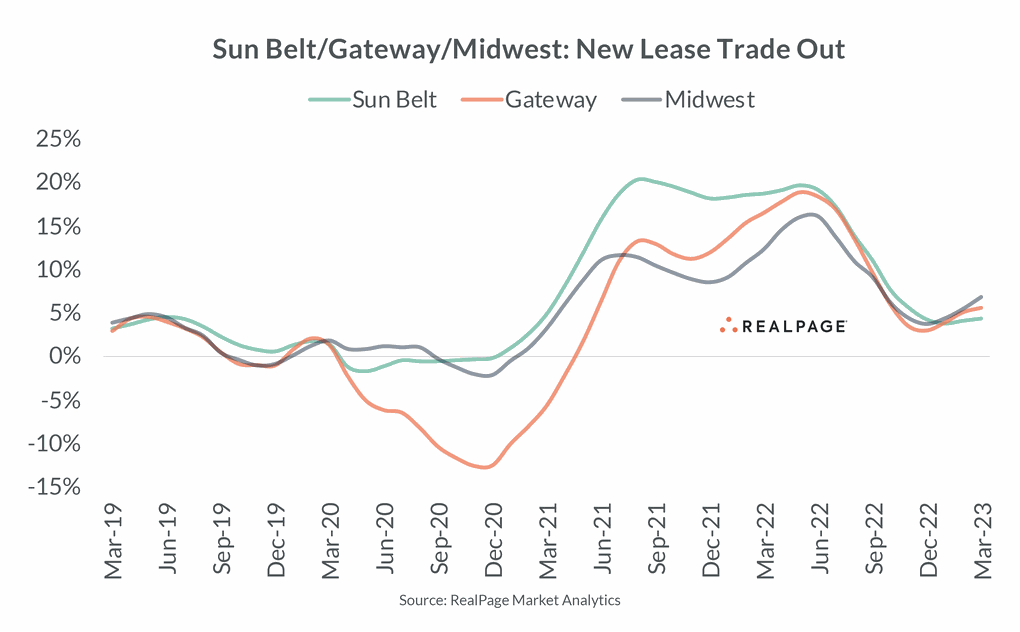 Midwest apartment markets shine the brightest during downturns. The slow-and-steady nature of these markets doesn’t seem as glamourous when the U.S. overall is experiencing surging fundamentals. But when performance softens in the nation overall, the nation’s heartland stands out in strength and resilience. In 2020, when the nation’s housing market was hit hard by the COVID-19 pandemic, the Midwest outperformed the flailing Gateway markets and stayed relatively in line with the Sun Belt. In 2021, Sun Belt market performance really took off, with new lease trade-out peaking at over 20%, leaving the Midwest to its slow-and-steady pace around the 10% mark. When the Gateway performance bounced back and hit a performance peak near 19% in 2022, the Midwest continued to log a solid – but less flashy – expansion, closer to 16%. In 2023, as moderation has become widespread across the U.S., the Midwest performance has snuck ahead of the Sun Belt and Gateway markets. New leases are now signing for almost 7% more than the previous lease in the Midwest, a few ticks ahead of the Gateway and Sun Belt.