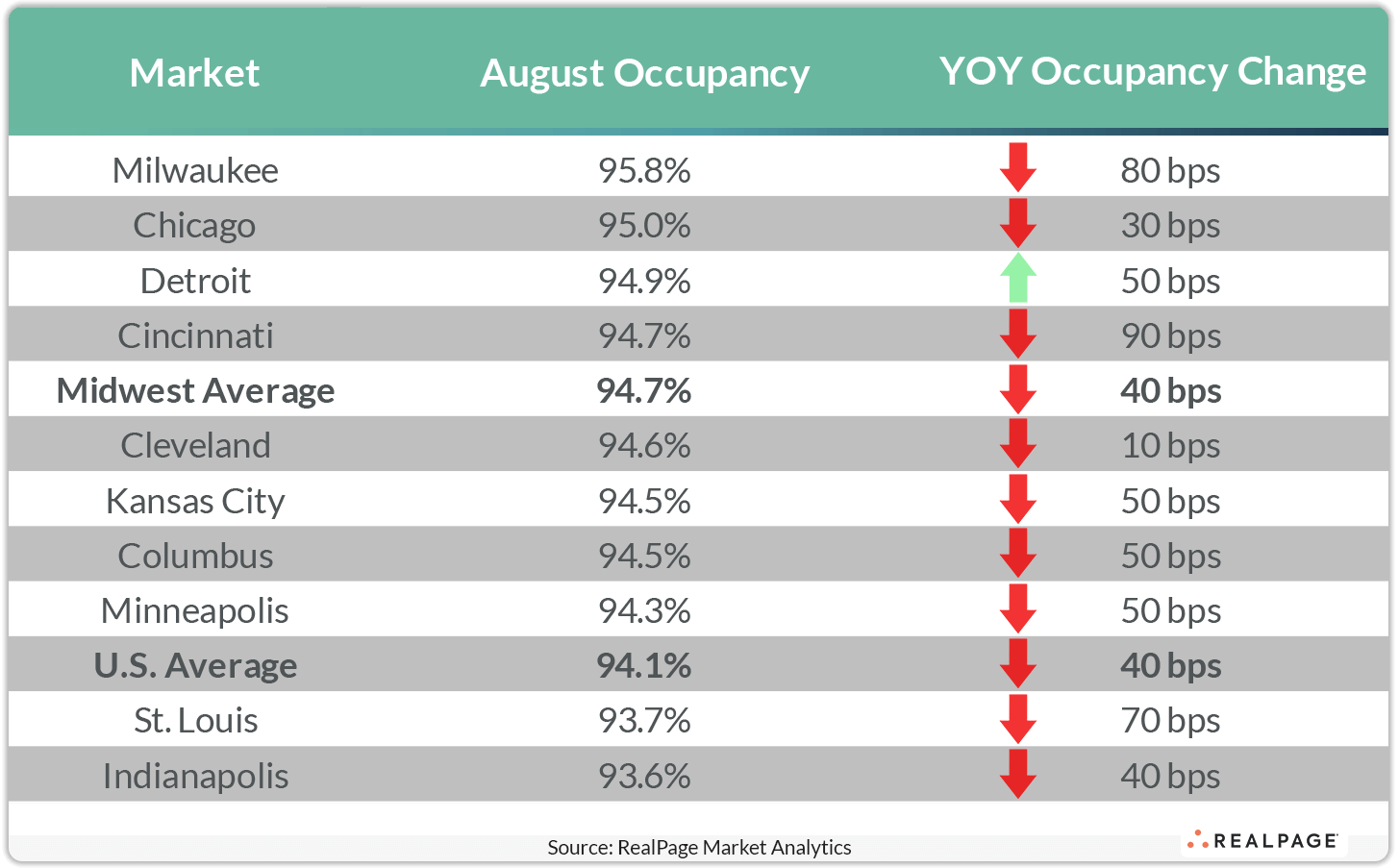 The only Midwest markets reporting August occupancy behind the U.S. average of 94.1% were St. Louis and Indianapolis, where rates were just shy of that mark at 93.7% and 93.6%, respectively.