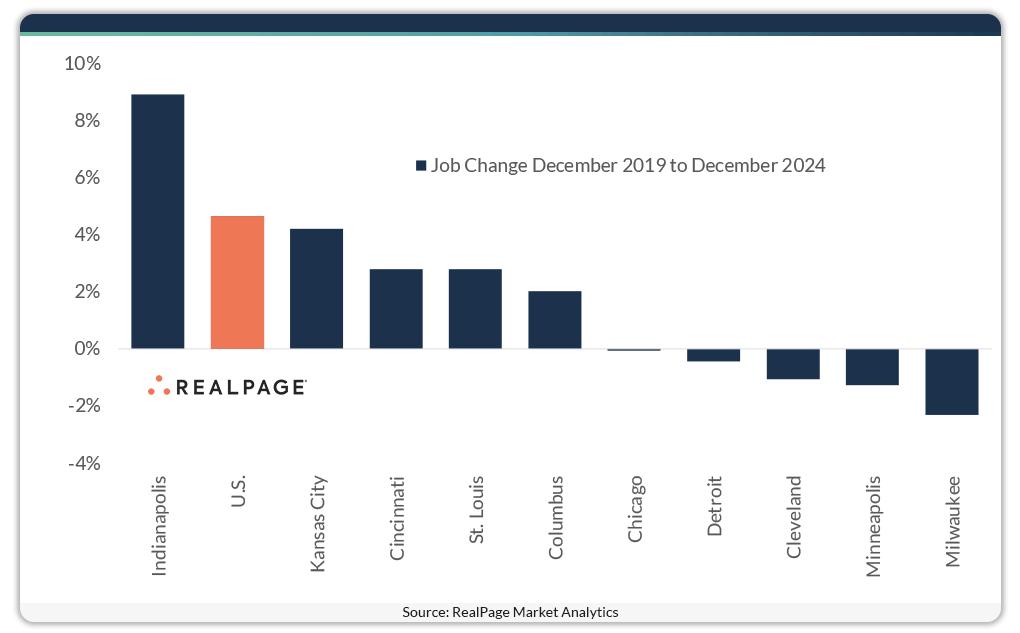 Like much of the U.S., every metro across the Midwest lost a lot of jobs during the COVID-19 pandemic, but the road to recovery hasn’t been as easy in the Midwest as it has been in some other regions. In fact, in some major Midwest markets, the job base at the end of 2024 continued to lag employment levels from the end of 2019. Milwaukee, Minneapolis and Cleveland have had the hardest time returning to pre-COVID job levels, as employment counts at the end of 2024 were still roughly 1% to 2% behind year-end 2019 numbers. It should be noted, however, that Cleveland and Minneapolis are making progress. Milwaukee, in contrast, lost another 2,600 jobs in 2024, specifically. The Detroit and Chicago employment bases were roughly fully recovered by the end of 2024, with job numbers essentially matching pre-COVID levels. Major Midwest markets topping 2019 norms by roughly 2% to 4% were Columbus, St. Louis, Cincinnati and Kansas City. The one major Midwest market with a year-end 2024 job count notably ahead of pre-COVID norms was Indianapolis. In fact, job growth in Indianapolis since the end of 2019 just missed a top 10 performance, coming in at #15 with growth of 8.9%, lagging just a bit behind Las Vegas and Houston.