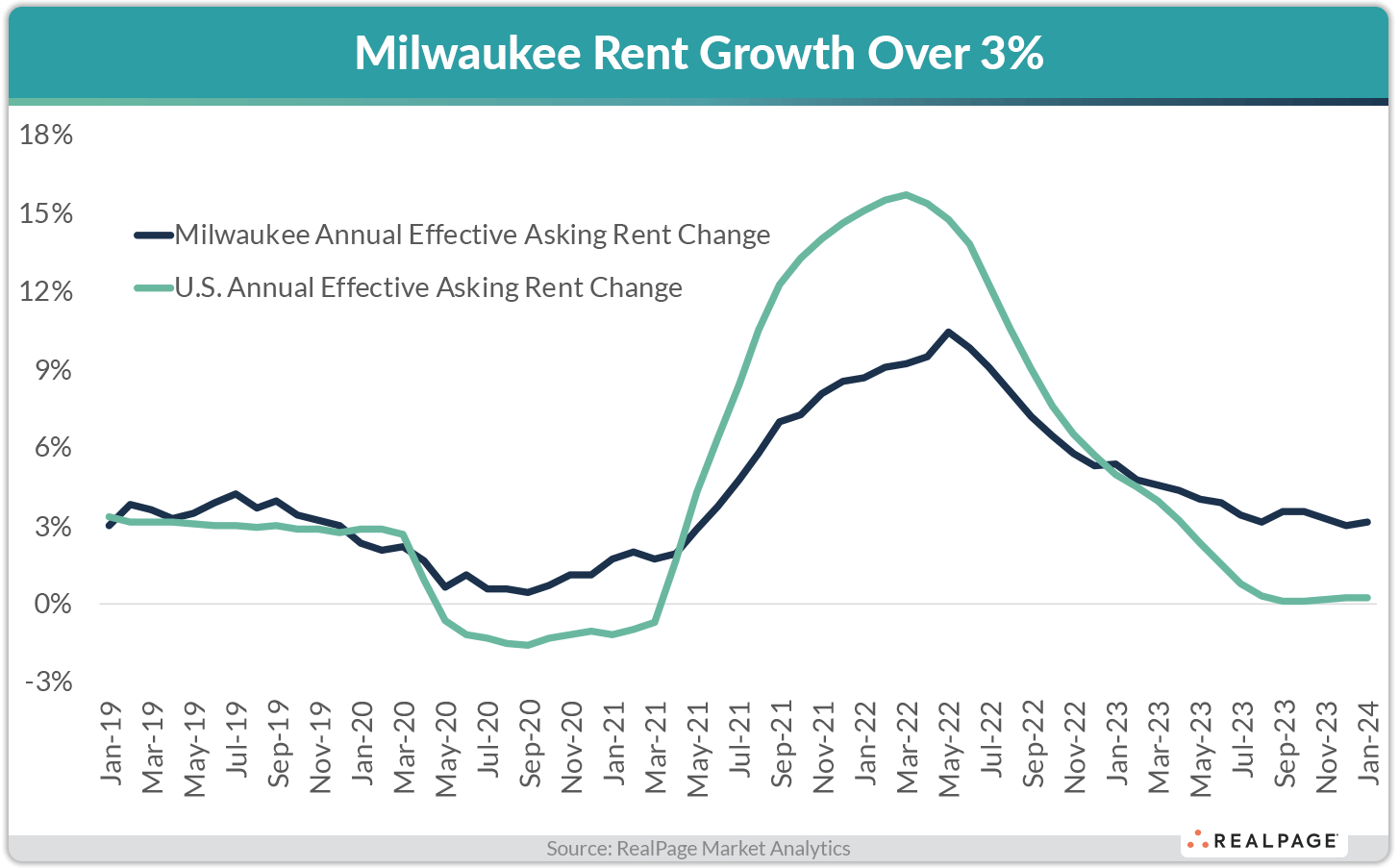 Milwaukee was also a market leader for rent growth recently. Effective asking rents increased 3.1% in the year-ending January, a #5 performance among the nation’s largest 50 apartment markets. Other markets ranking in the top 5 spots include Cincinnati, Boston, Chicago and Washington, DC.