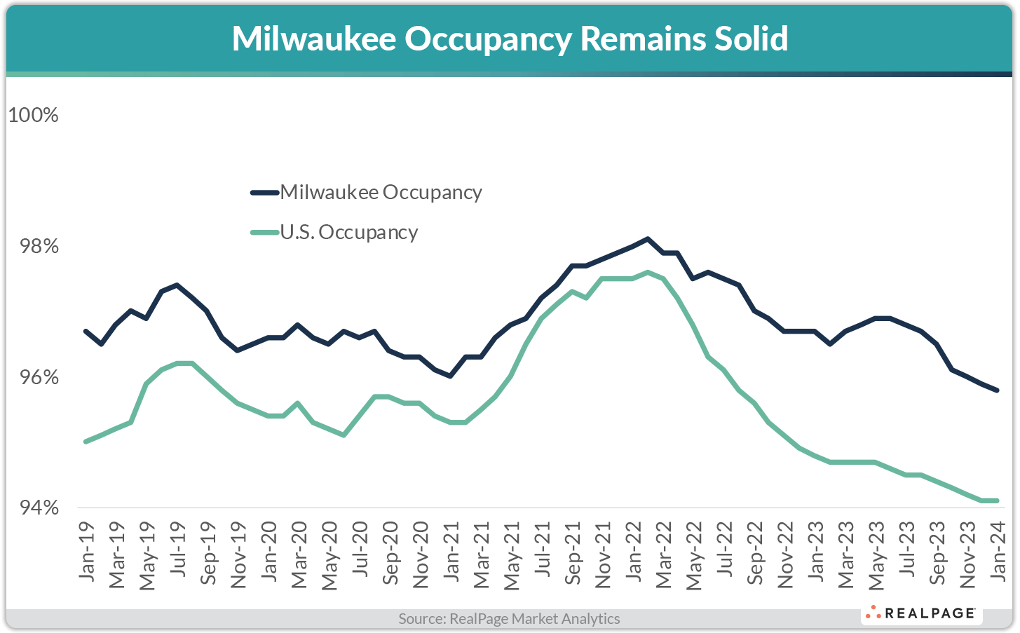 Milwaukee logged one of the best occupancy performances in the U.S. in January, with a rate of 95.8%, according to data from RealPage Market Analytics. This was the fourth-best showing among the nation’s largest 50 apartment markets. The remaining markets to rank in the top five were typical high-occupancy markets: New York, Newark, Anaheim and San Francisco.