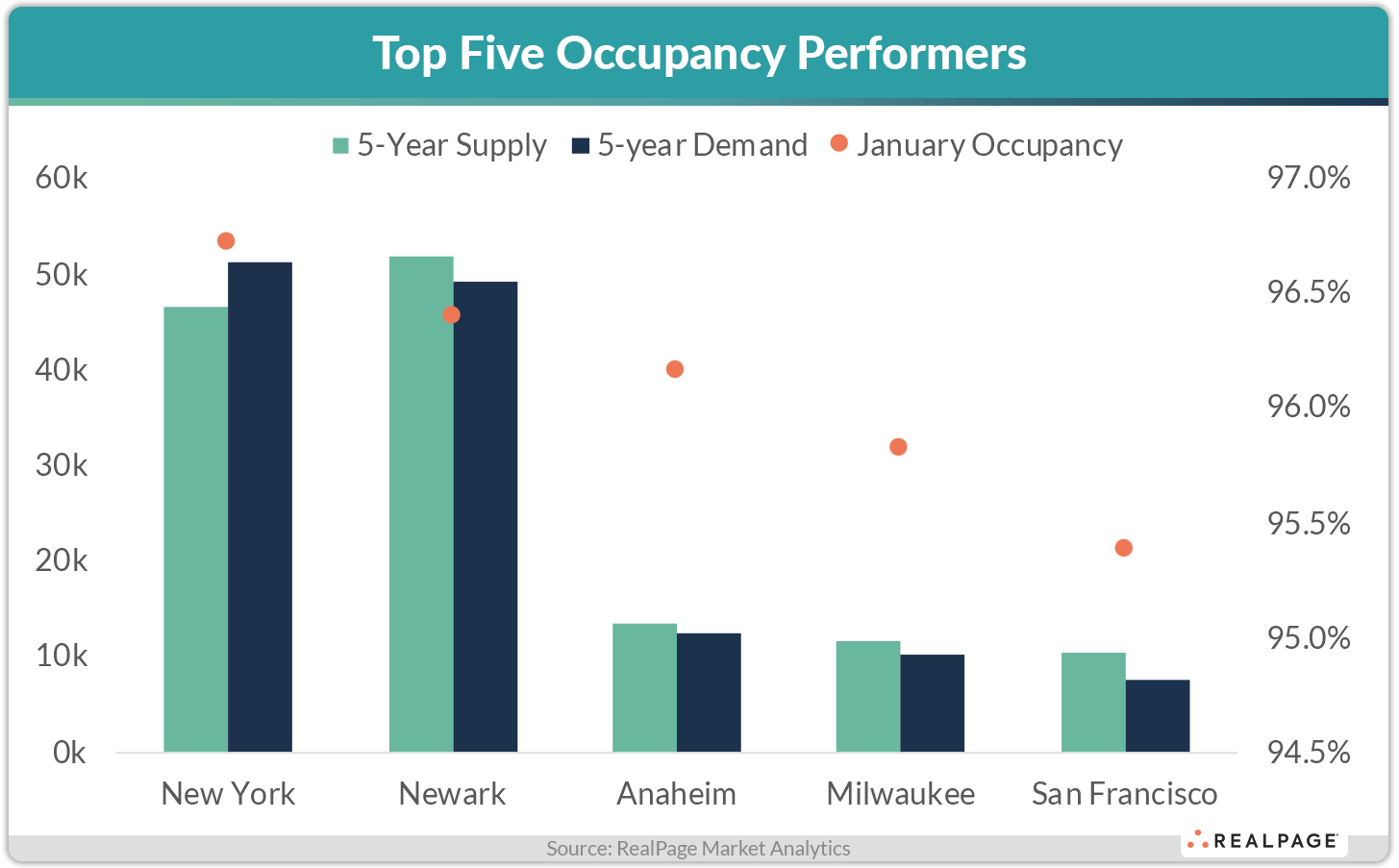 When looking at the top five occupancy performers in January, strong demand wasn’t necessarily the governing factor either. While New York and Newark recorded solid demand tallies in the past five years, the absorption performances were more mild in Milwaukee, Anaheim and San Francisco. Supply followed the same pattern – five-year additions were notable in the Northeast markets, and more reasonable in the Midwest and the West Coast.